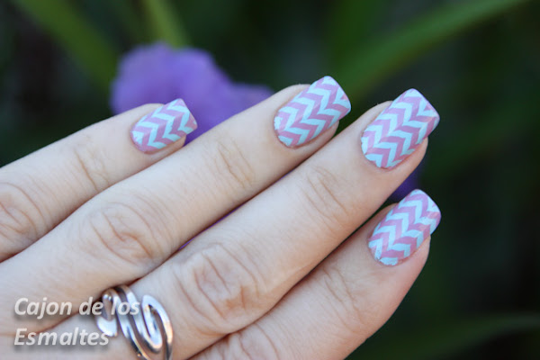 Empezaremos con la uña al natural, y aplicaremos una capa de el base coat una vez este seco procedemos con la aplicación de de la base blanca, nos aseguramos que quede un blanco solido, la base del diseño es siempre muy importante, aquí es muy importante que aquí apliques de nuevo una capa de top coat y esperes que se seque completamente, coloca las cintas con el diseño quizás necesites una pinza para ubicarlas bien, pinta la punta con el color purpura como es un área pequeña es posible que necesites un pincel mas pequeño, aplica el esmalte azul y retira la cinta superior , esto es importante por que lo debes hacer antes de que este seco, procede ahora a pintar la próxima sección de color verde menta y retira la cinta del anterior. Espera pacientemente que el diseño seque y cubre y sella con una capa de Top Coat. Y eso es todo , tienes tu hermoso diseño Chevron.