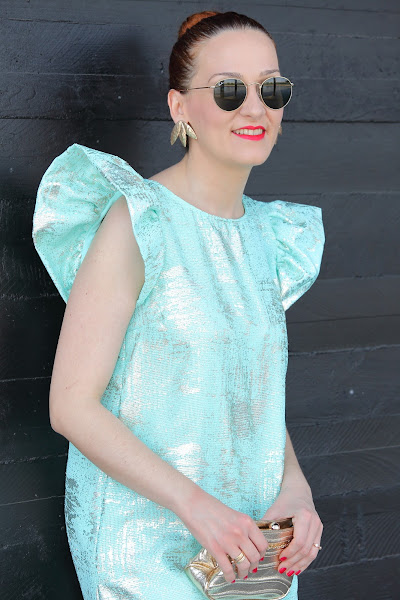 Termino la semana con un vestido que me tiene conquistado el corazón desde la primera vez que lo vi. Me gusta todo de él, su tono aguamarina ideal para el verano, los maxi volantes de las mangas y el dorado de la tela. Es un vestido que dependiendo del tipo de complementos que le combines puedes llevarlo para un evento o simplemente en una noche de verano.