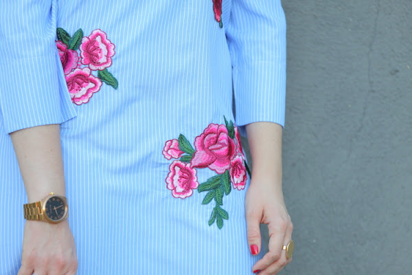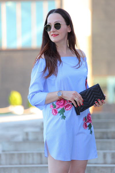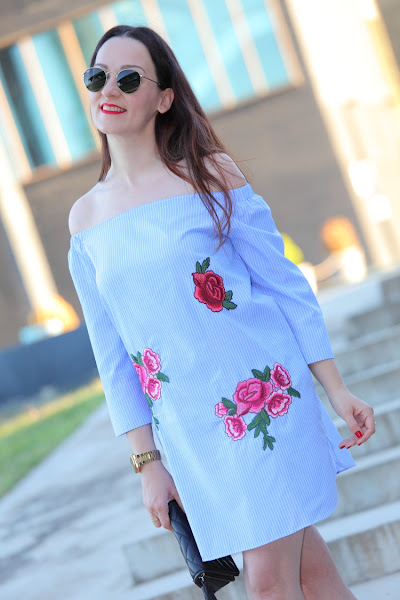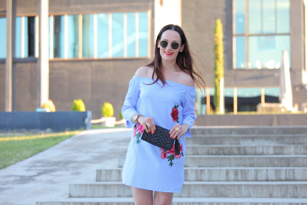De cara a la nueva temporada las prendas con bordados de flores van a ser uno de los imprescindibles. Por eso, aunque siempre me digo a mi misma que hasta que no termine el verano no compraré nada de la nueva temporada, fue ver esta preciosidad de vestido y acabé comprándolo. Lo tiene todo, el bordado de flores, las rayitas en azul bebe y blanco, el escote bardot... Hoy lo llevo como vestido junto con unas sandalias y clutch negros, pero os lo enseñaré también como camisola con tejanos y stilettos que igualmente queda genial.