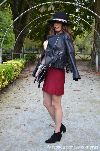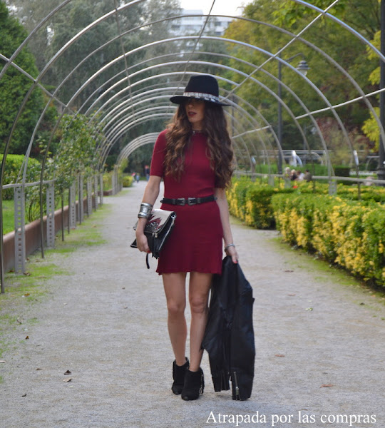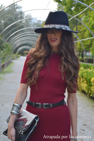 El invierno pasado el canalé fue una de las tendencias estrellas y esta nueva temporada otoño/invierno 2016/2017 prometer repetir. Hoy os enseño un look con un vestido de canalé granate de media manga perfecto para esta época del año, podemos decir que se trata de un vestido básico y que de nosotras depende el estilo que le quedamos dar. En este caso decidí crear un look con un estilo entre bohemio y western ayudándome de los complementos, un cinturón cowboy de doble hebilla, (super de tendencia, no debe faltar uno en vuestra wishlist de esta nueva temporada), botines camperos con flecos, un sombrero fedora y como no, un choker de cuero. Como prenda de abrigo le añadí una perfecto de cuero con flecos de hace un par de temporadas.