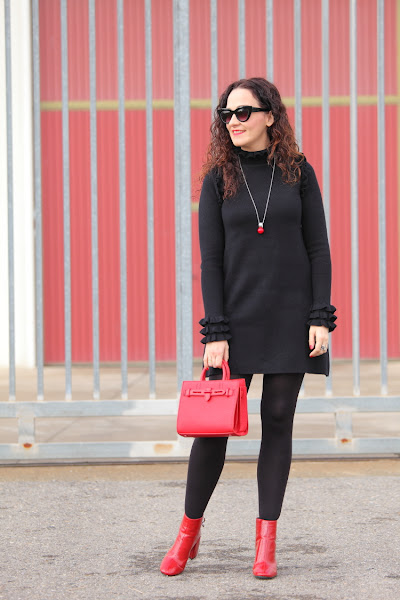 Ya sabéis que el negro es mi color favorito, pero después de abusar durante bastante tiempo de él ahora intento evitarlo introduciendo otros colores en mi vestidor. Como habréis comprobado, creo que lo he conseguido por eso de vez en cuando me doy el capricho y creo algún total black. Hoy es uno de esos días, con el frío que hace nada mejor que un vestido de punto calentito al que le he dado vida con los complementos.