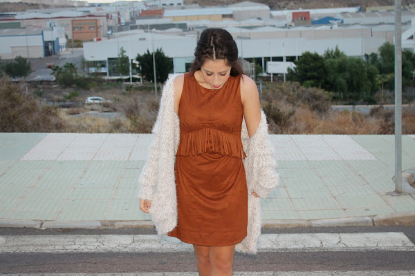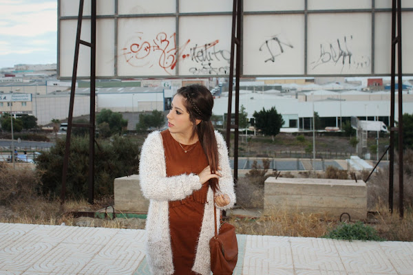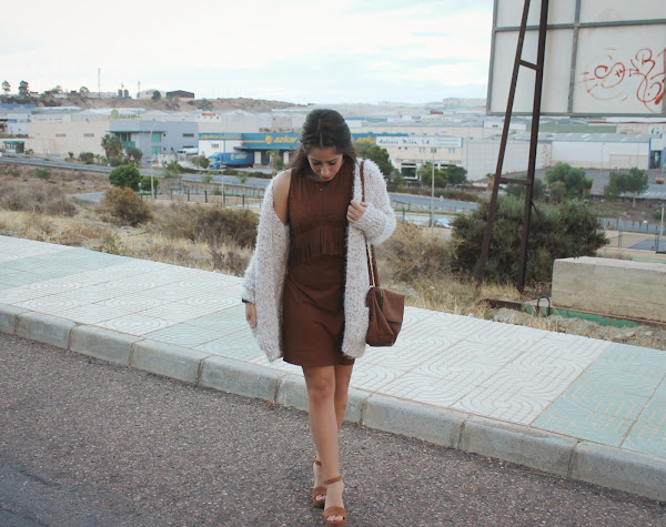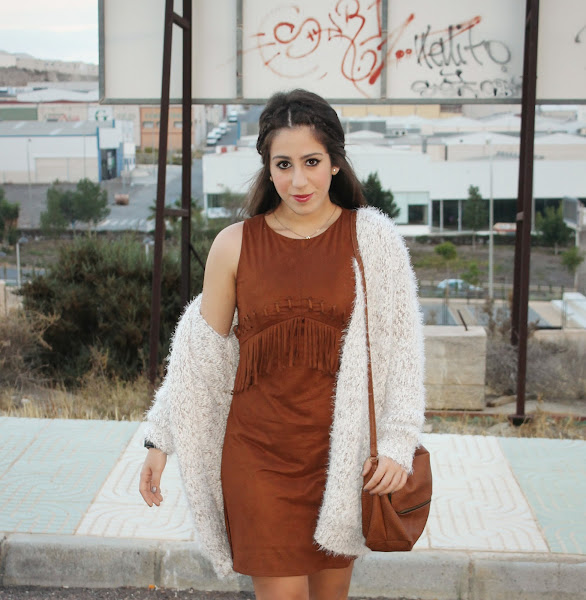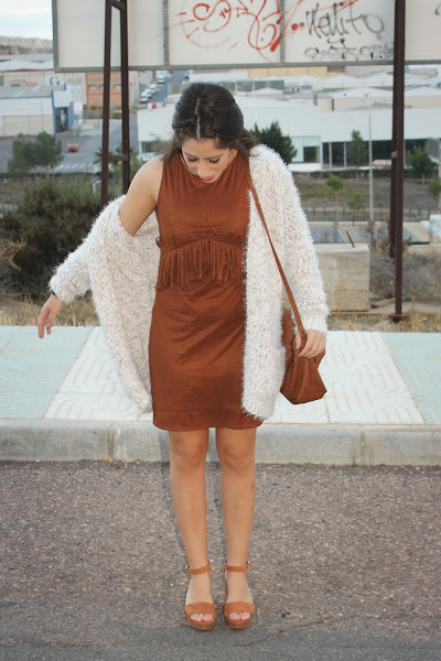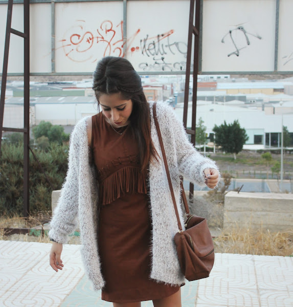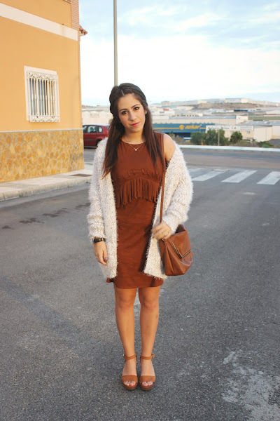 Llevo un vestido de ante marrón súper cómodo y perfecto para esta temporada en la que no hace ni frío ni calor. Lo he combinado con un cárdigan blanco, ideal para estas mañanas tan frioleras.