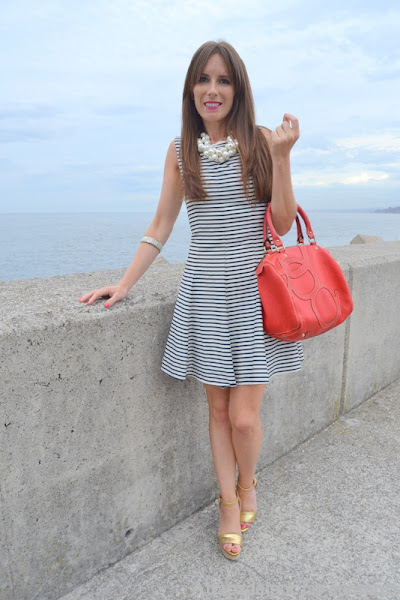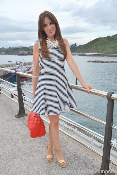 El estilo navy se ha convertido con el paso del tiempo en un básico en nuestros looks veraniegos, podríamos decir que con más o menos fuerza, temporada tras temporada es tendencia. Una de las formas en las que podemos lucir uno de estos looks marineros es con un vestido de rayas con la clásica combinación azul marino y blanco como el que os enseño en el look de hoy, lo combiné con un bolso rojo, otro de los colores típicos en estos looks, y cuñas de esparto. Un look cómodo y elegante adaptable a cualquier ocasión.