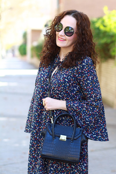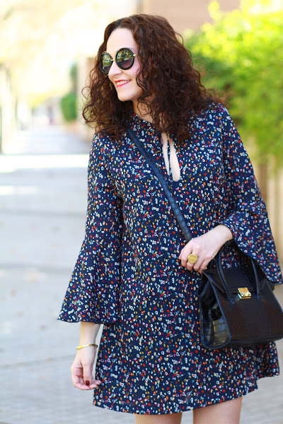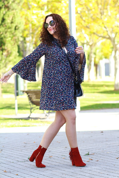 Adoro la tendencia setentera que se lleva este invierno, por eso cuando vi este vestido supe que tenía que ser mío. Me encanta, lo veo muy alegre gracias al estampado tan colorido y las mangas acampanadas también le aportan un toque muy especial. Lo estrené para una celebración familiar que tuve hace un par de semanas y lo llevé con mis nuevos botines de flecos de color burdeos y bolso azul marino.