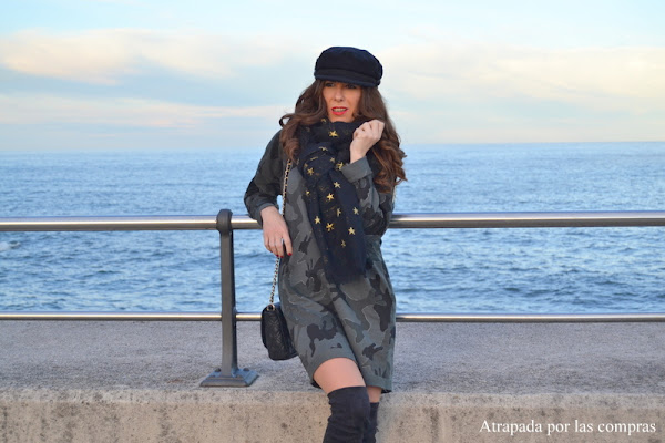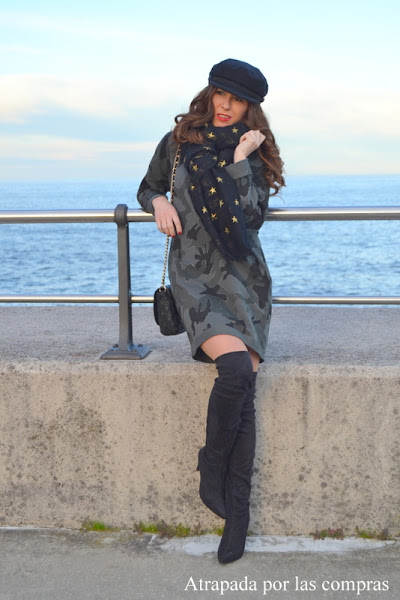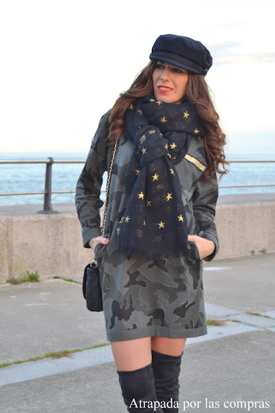 Esta temporada las sudaderas se alargan hasta convertirse en vestidos y sus cortes se convierten en oversize, una de las máximas precursoras de esta tendencia es la firma Rag & Bone que incorporó a su colección otoño/invierno 2016/2017 varios vestidos sudadera. Hoy os enseño un vestido sudadera con estampado de camuflaje y detalles dorados de la tienda COMO TU MODA Y COMPLEMENTOS , la tendencia militar sigue muy presente así que una prenda con este estampado no debe faltar entre nuestras compras para esta temporada. Este tipo de vestidos nos dan mucho juego a la hora de combinarlos, podemos optar por un look cómodo y deportivo o darle un giro y combinarlo de una forma más sofisticada. Yo opté por esta última opción ya que además se adapta más a mi estilo y para ello lo combiné con unas botas over the knee o xxl, y un fulard negro con estrellas doradas que, aunque sean estampados diferentes, empasta a la perfección con el vestido al llevar los mismos tonos. Qué os parece el look?