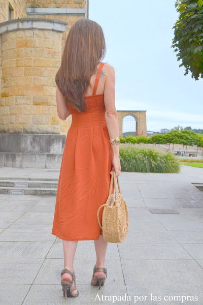 Uno de los colores de la próxima temporada otoño/invierno 2018 va a ser el color teja, un tono cálido muy favorecedor y, aunque en un principio puede parecer difícil de combinar, con determinados colores como el azul, el verde o el blanco puede quedar de 10. En el look de hoy os enseño un vestido color teja con botones delanteros que combiné con animal print, otra de las tendencias punteras del próximo otoño 2108, en este caso con unas sandalias de pitón que tienen un montón de años (el que guarda.....). Un cesto de mimbre como bolso rematan el look.