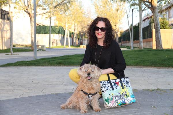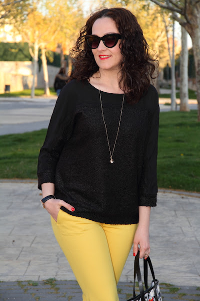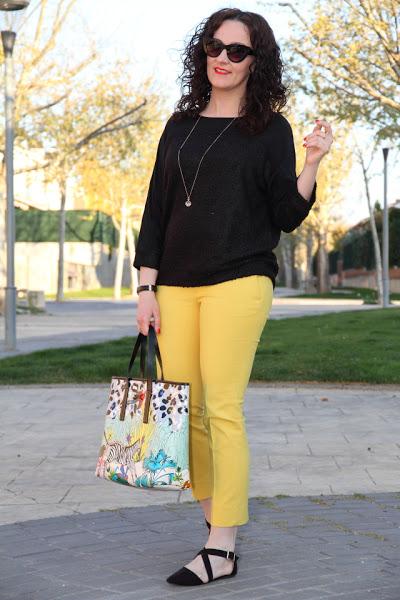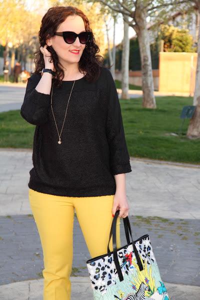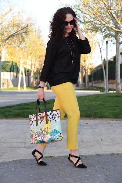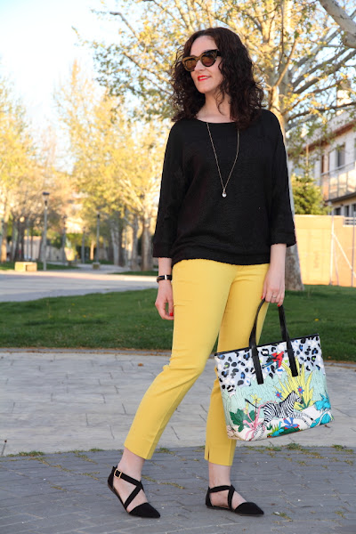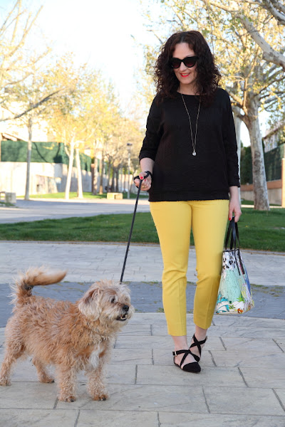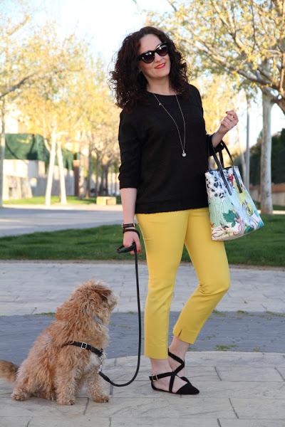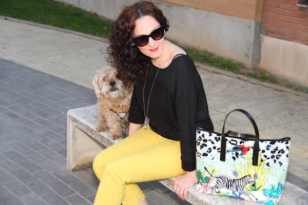 Tenía pendiente ensañaros estas fotos que hicimos un día paseando con Nico. Los que me seguís en Instagram y Twitter ya sabéis que ahora Nico lleva el pelo cortito, justo la misma semana que las hicimos se lo cortamos así que en estas fotos aun luce sus "melenas". Yo llevo un look en el que combino mis dos colores favoritos, el amarillo y el negro, compuesto por un jersey suelto y pantalones capri. Le añadí un bolso con un print muy colorido y original que le dio el toque especial al look. Unos zapatos negros súper cómodos y a disfrutar de un paseo con el rey de la casa.