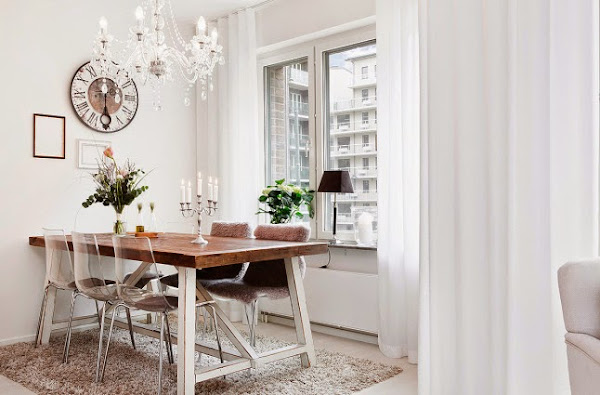Las que me conocéis, y conocéis mi casa, sabéis que soy muy de blanco, las paredes blancas, la cocina blanca, la escalera blanca... me parece un color limpio, elegante, luminoso (y muy fácil de pintar cuando los niños te dejan todas las manos pintadas en la pared...) . Por eso os dejo este piso, creo que tiene todo lo que yo querría... me encanta la mesa de comedor pegada a la pared (esta idea me la copio), el borde en color madera de la cama de Ikea (cama que creo que está en todas las casas del mundo!), el bote del jabón de cocina... ¿Qué os parece?
