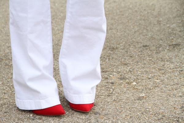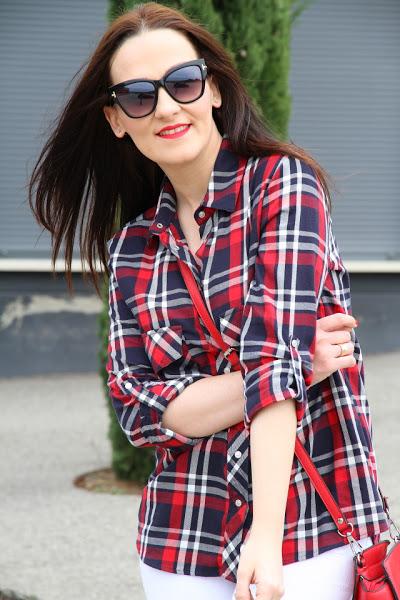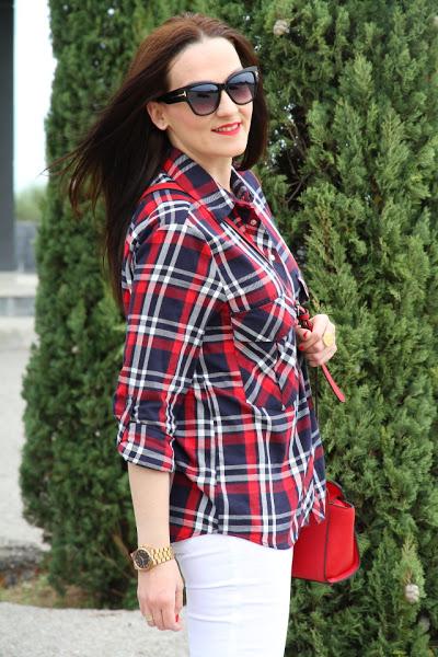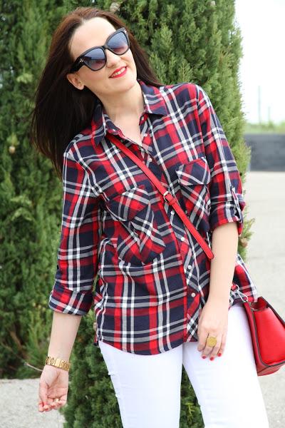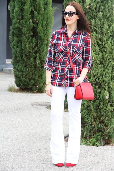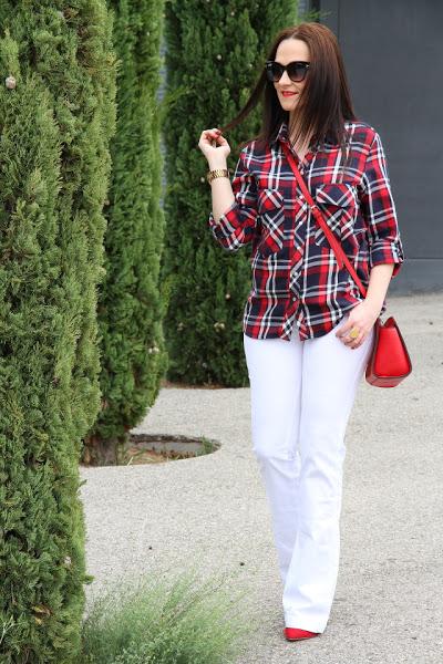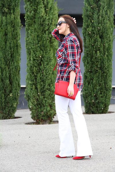Hace unos días os enseñé este look en mis redes sociales gustándoos bastante, así que el día que volví a ponérmelo aproveché y sacamos unas fotos con él. Combiné una camisa de cuadros rojos con unos tejanos blancos acampanados. Ya sabéis cuanto me gustan esta clase de pantalones, así que no pude esperarme a que estuvieran los de nueva temporada en las tiendas y me compré los que veis en Mango Outlet. Lo mejor de todo es que estaban a un precio de risa y son iguales que los de esta temporada.