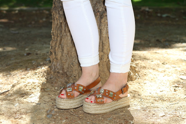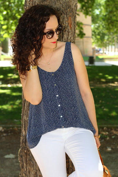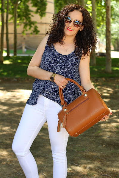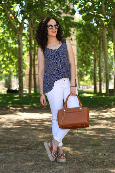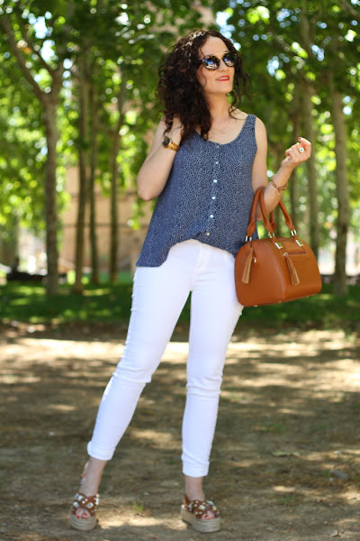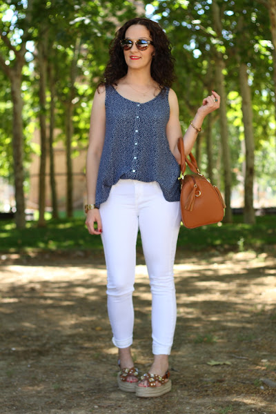 Como ya os he comentado alguna vez y vosotros mismos os habréis dado cuenta, en verano tan apenas llevo tejanos. Aunque siempre he pensado que es una prenda fantástica en verano me dan mucho calor y suelo huir de ellos, pero esto no quiere decir que haya momentos en que me apetezca llevarlos como hace unos días que decidí estrenar estos jeans pitillo que tenía en el armario desde principios de la temporada. El look que monté con ellos fue muy casual: un top suelto de topitos, bolso camel y estas bonitas esparteñas que con jeans quedan genial.