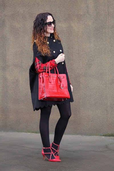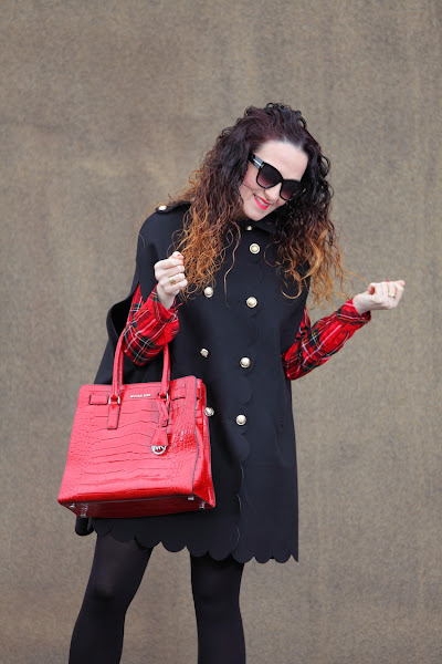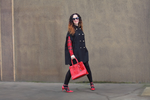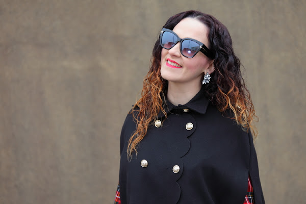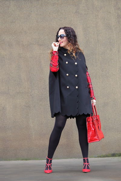 Algunas de vosotras que ya me conocéis desde hace tiempo sabéis lo friolera que soy, y para las que hace poco que me seguís, ya iréis viendo que no me gusta nada el frío y que en invierno los looks cebolleta son mis preferidos. Por eso mismo, durante esta época los ojos siempre se me van detrás de las prendas de punto gorditas y también de los abrigos, sobre todo los peludos que me chiflan. Hoy estreno mi nueva capa, ideal para ir estilosa y calentita como a mi me gusta. Lo que más me llamó la atención cuando la vi la primera vez fue el detalle de los bajos y la doble abotanadura estilo militar, tan de moda esta temporada. La llevo con una camisa de cuadro escoces en rojo que combino con unos zapatos también rojos que os enseñé a finales del verano y que os encantaron. Además, me coloqué mis nuevos pendientes de cristal, ideales para dar un punto de luz muy chic al estilismo.