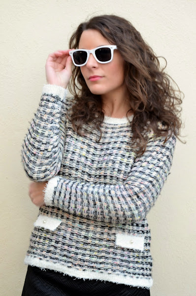 Bueno, a lo importante, el look, donde el protagonista es mi jersey de estilo tweed. ¿Y qué es el tweed? Es un tejido que se convirtió en icono de la alta costura gracias a Chanel. La diseñadora lo introdujo en su vestuario por la comodidad y la calidez que le aportaba este tejido a la hora de vestir. El look que os muestro hoy es otro working girl. Llevo jersey de lana combinado en blanco negro con hilos cruzados de colores, falda negra y complementos en negro. Desde mi punto de vista un look ideal para ir a la oficina, cómodo y con un toque chic.