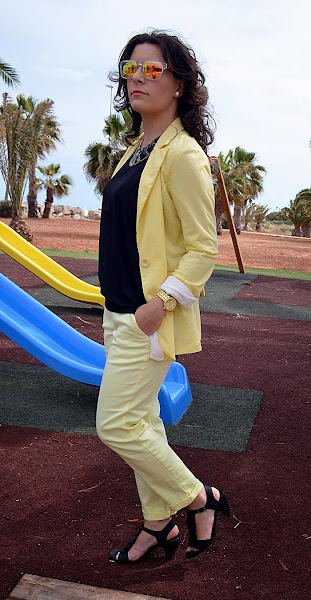 Hoy os muestro un look donde predomina el amarillo. Lo vemos en un tono suave en la blazer y en los pantalones tobilleros, pero he querido combinarlo con un básico, el negro, ya que ambos colores juntos hacen una mezcla perfecta.