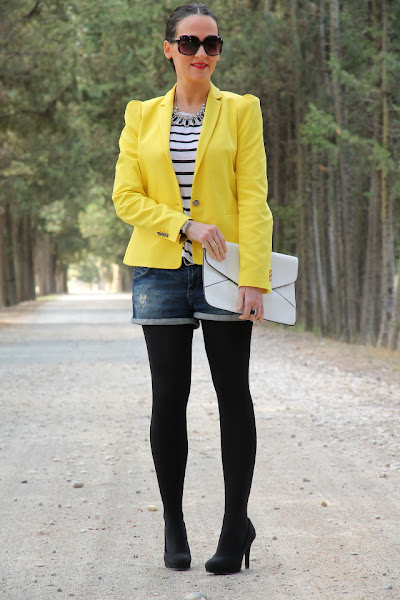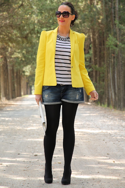 Ya sabéis que el amarillo es uno de mis colores favoritos para el verano, y si lo combinamos con estampados navy aun me gusta más porque se crean outfits muy alegres y veraniegos. Así que no hace falta que os diga que este look con blazer amarilla, camiseta navy y shorts tejanos pasa a ser uno mis preferidos.
