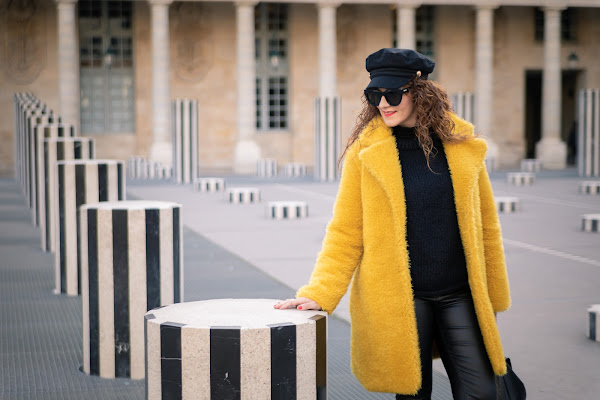 El abrigo que llevo hoy fue un amor a primera vista, lo vi y supe que tenía que ser mío. Además de que es amarillo, como ya sabéis es uno de mis colores favoritos junto al negro, es muy gustosito a la vez de caliente y lo mejor que no pesa nada. Como veis me acompañó en mi viaje a Paris y aunque lo combiné de diferentes maneras, con el total look negro es como más me gusta. Os lo enseño con más detalle en estas fotos desde el Palais Royal, uno de mis lugares favoritos de Paris.