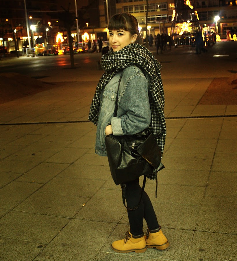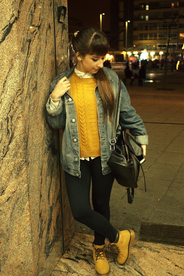 Pero me encanta la combinación de colores. El mostaza, es uno de mis colores favoritos en invierno,detalles negros en bufanda y mochila de cuero, muy de tendencia, terminando con las típicas chaquetas vaqueras vintage atemporales.
