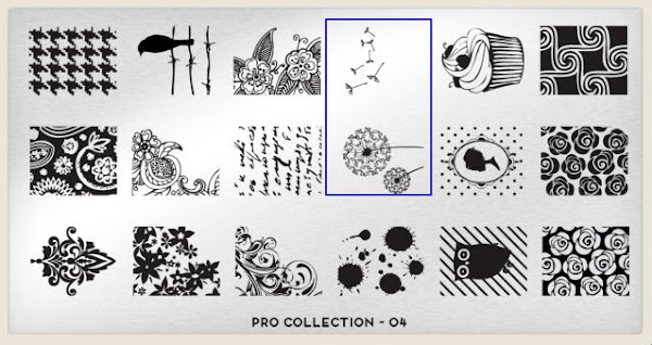 Esta placa de estampar (Pro Collection 04) fue la primer compra que hice a Moyou London y el diseño de diente de león o Dandelion me enamoró desde el primer momento. El color de base es el Hedgehog in the Fog de Dance Legend que les mostré ayer y el plateado es un Kiko de la colección Mirror.