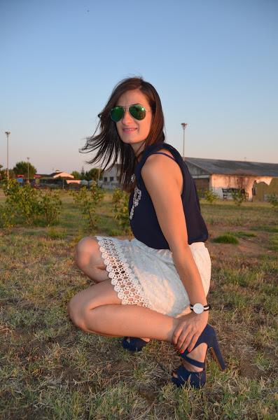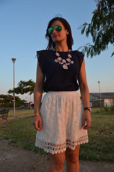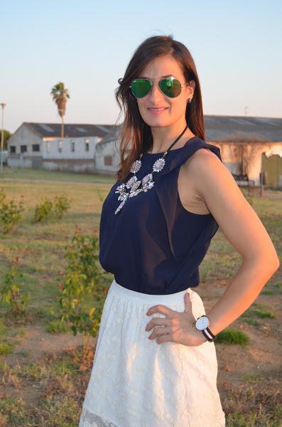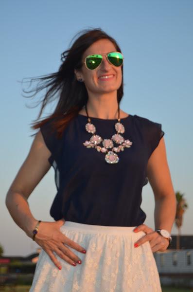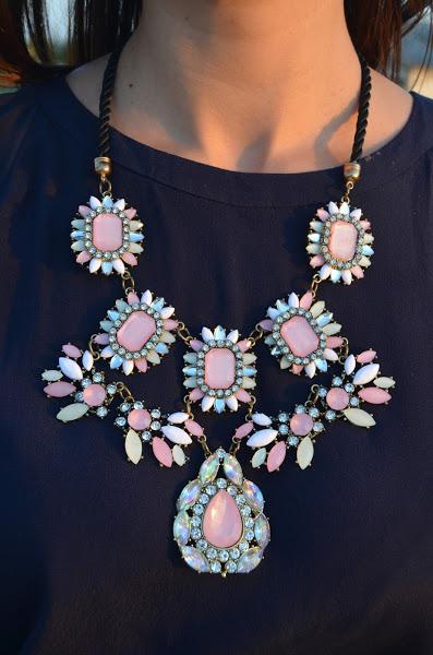 Como complementos un maxicollar rosa de LA METAMORFOSIS DE LAURA, me encanta como combinan el rosa y el azul marino.