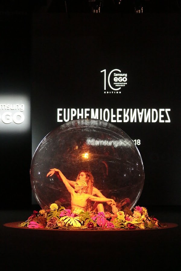 Euphemio Fernandez también hizo un guiño a la danza contemporánea en la presentacion de su coleccion LOS AMANTES que cierra su la trilogía de la vida, que empezó con la muerte (MANIFIESTO SS2017), que continuó con la vida a través del sentimiento del odio (LOS ODIOSOS.17/18) y que cierra el círculo con el concepto de infancia, inocencia y amor que iniciará un proceso de creación de distintas formas oníricas a través de los bailarines, los cuales desarrollaron su performance dentro de una original burbuja en medio de la pasarela.