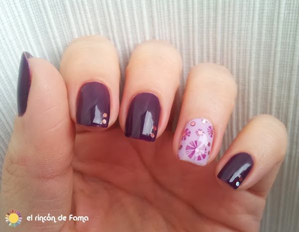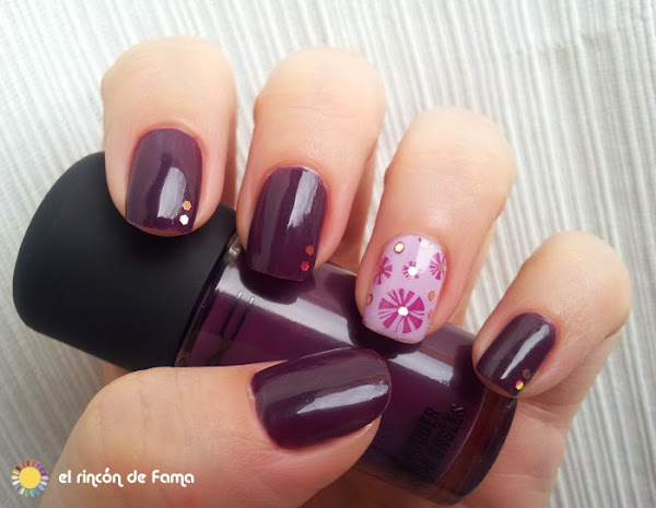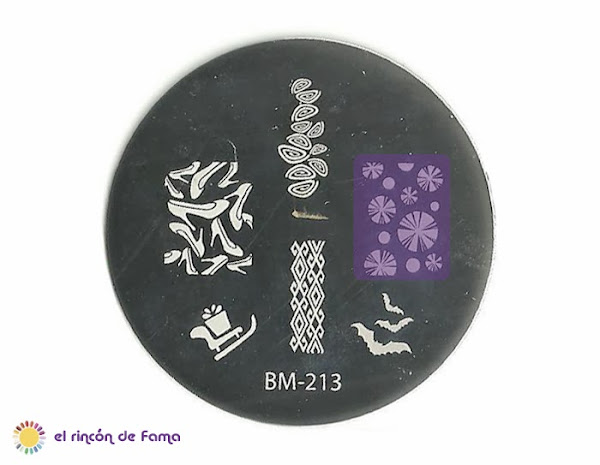 Para la decoración, como ya os he dicho, opté por algo sencillo: unos glitter hexagonales en el extremo de cada uña al aplicar la última capa y un cambio de color con estampación para la uña de acento. Elegí un diseño que me encanta del segundo paquete de las Bundle monster, os lo marco: