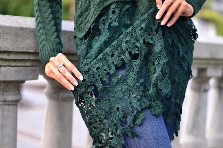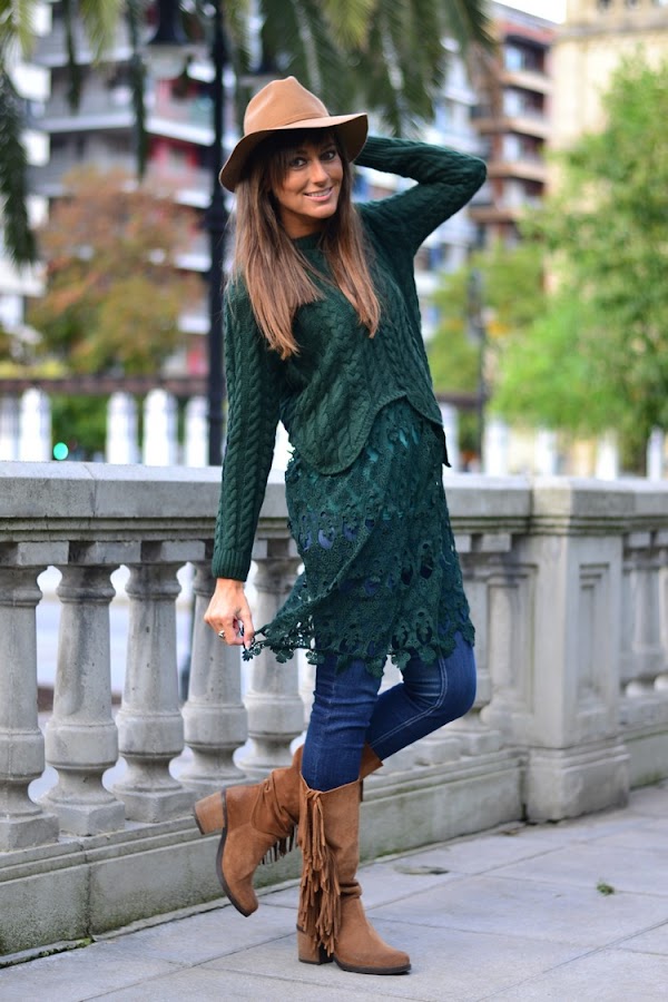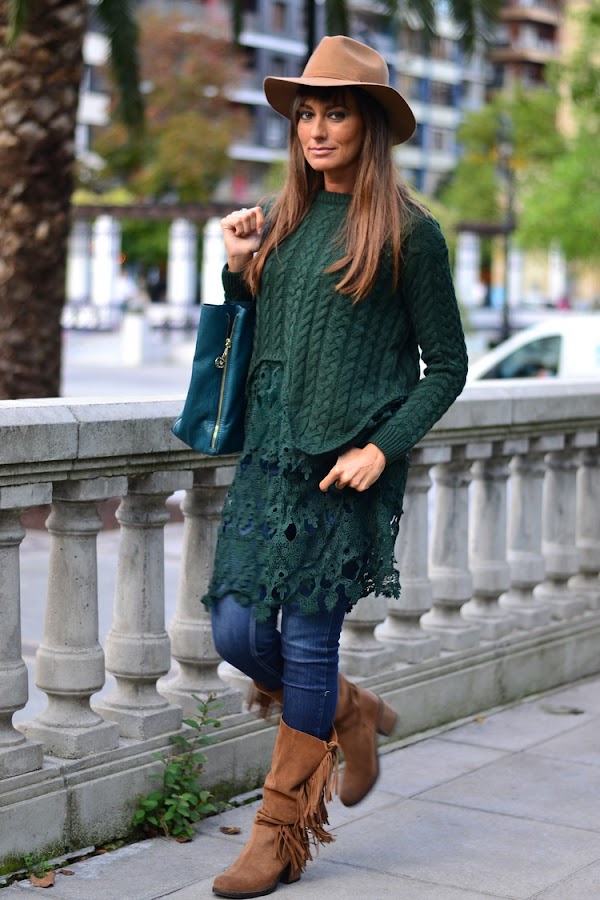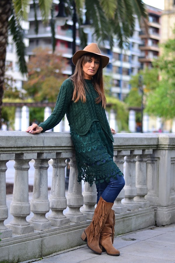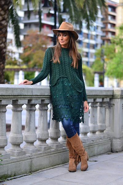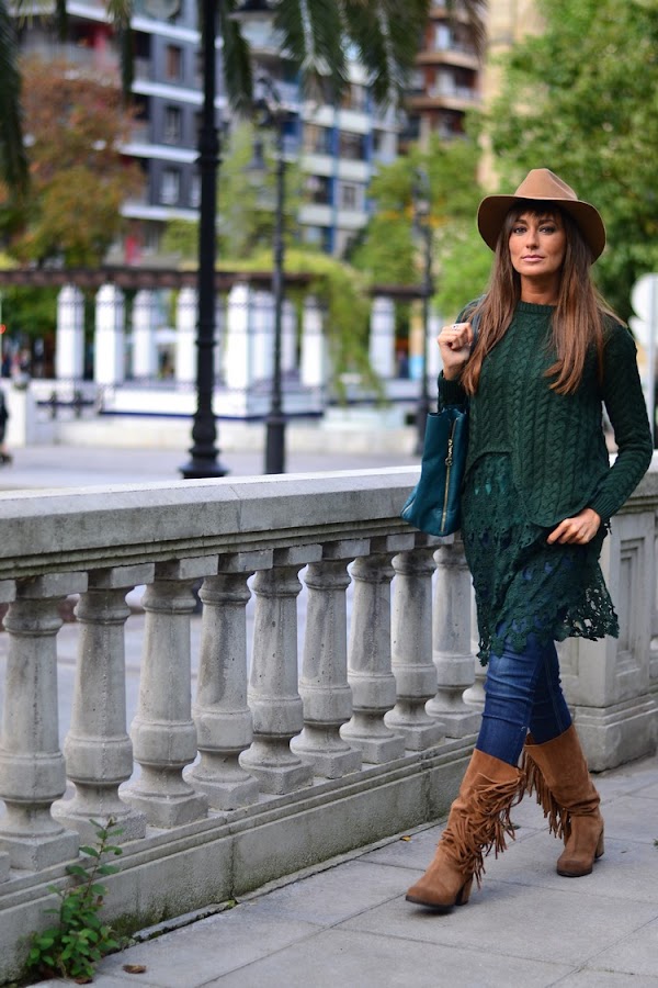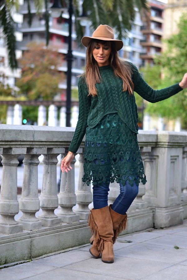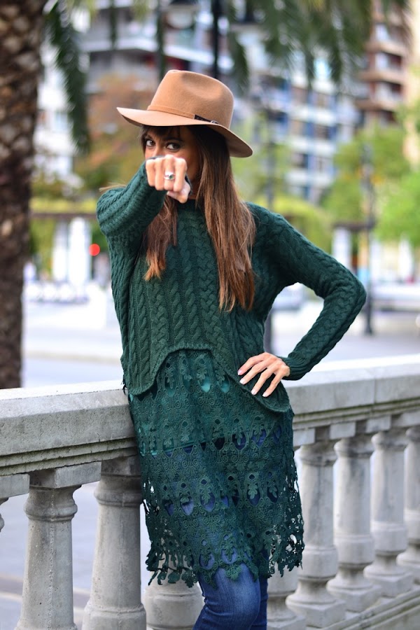 Hoy quiero compartir con vosotras algunas de las imágenes que me tomé el otro día cuando estrené esta prenda de punto para el otoño en verde botella, tan curiosa. No sabría muy bien definirla si como un jersey o como un vestido... calado por abajo. El caso es que, desde que la viera en Romwe, supe que quería que fuese mía y, finalmente, llegó a casa la semana pasada, justo a tiempo para abrigarme en el puente. Por cierto, felicidades a todas las Pilares.