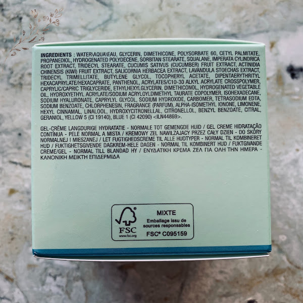 Water\Aqua\Eau, Glycerin, Dimethicone, Polysorbate 60, Cetyl Palmitate, Propanediol, Hydrogenated Polydecene, Sorbitan Stearate, Squalane, Imperata Cylindrica Root Extract, Tridecyl Stearate, Cucumis Sativus (Cucumber) Fruit Extract, Actinidia Chinensis (Kiwi) Fruit Extract, Salicornia Herbacea Extract, Lavandula Stoechas Extract, Tridecyl Trimellitate, Butylene Glycol, Tocopheryl Acetate, Dipentaerythrityl Hexacaprylate/Hexacaprate, Panthenol, Acrylates/C10-30 Alkyl Acrylate Crosspolymer, Caprylic/Capric Triglyceride, Ethylhexylglycerin, Dimethiconol, Hydrogenated Vegetable Oil, Hydroxyethyl Acrylate/Sodium Acryloyldimethyl Taurate Copolymer, Isohexadecane, Sodium Hyaluronate, Caprylyl Glycol, Sodium Hydroxide, Carbomer, Tetrasodium Edta, Sodium Benzoate, Chlorphenesin, Fragrance (Parfum), Alpha-Isomethyl Ionone, Limonene, Hexyl Cinnamal, Linalool, Hydroxycitronellal, Citronellol, Benzyl Benzoate, Citral, Geraniol, Yellow 5 (Ci 19140), Blue 1 (Ci 42090).