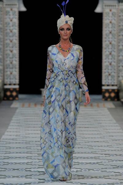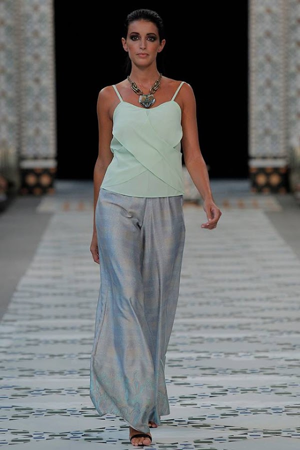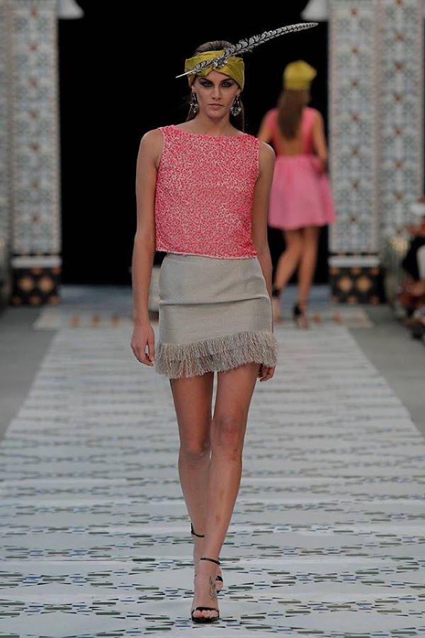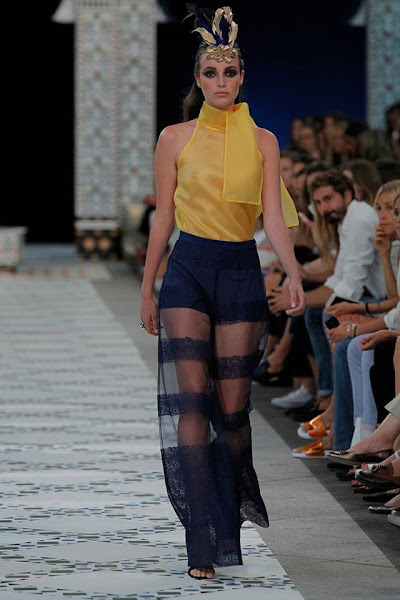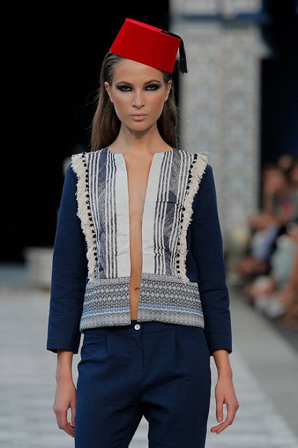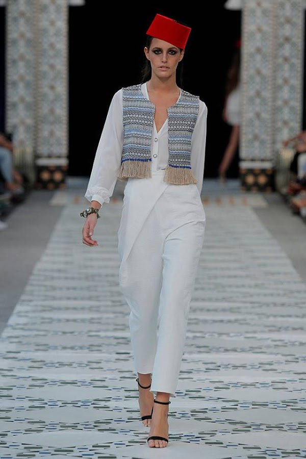 La tradición de las alfombras a través del estampado Kilim, los flecos, las borlas y los mosaicos más característicos de la cultura marroquí se convierten en protagonistas de una colección llena de estampados que se entremezclan de forma armoniosa en una misma prenda. Volúmenes exagerados, organzas brocadas y estampados inspirados en las palmeras juegan un divertido baile en los andares.El tejido de telar, regresa incorporando rayas desiguales y toques dorados que simbolizan los destellos del sol en el atardecer de la costa marroquí.