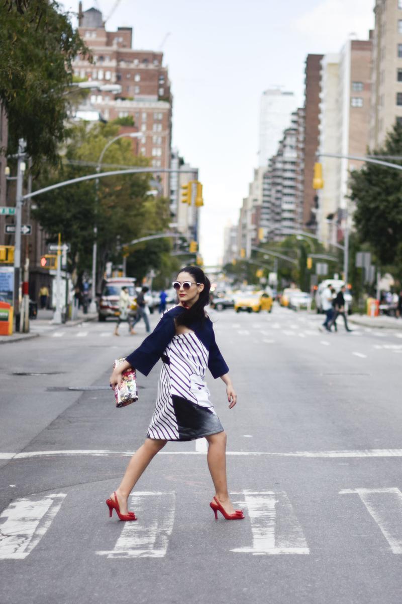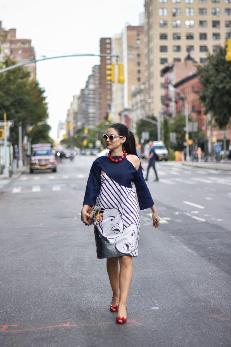 Estéticamente, la prenda es un vestido con una silueta muy geométrica, con cortes asimétricos en sus hombros. Mezcla varios de mis colores favoritos: azul navy y blanco, con detalles rojos. Quise resaltar los detalles rojos con mis accesorios: un collar corto pero grueso y unos tacones plásticos de la colección de Vivienne Westwood para Melissa. Sentía que el atuendo era muy pop, por lo que opté por un clutch blanco con fotos de portadas de revistas y lentes de sol blancos.
