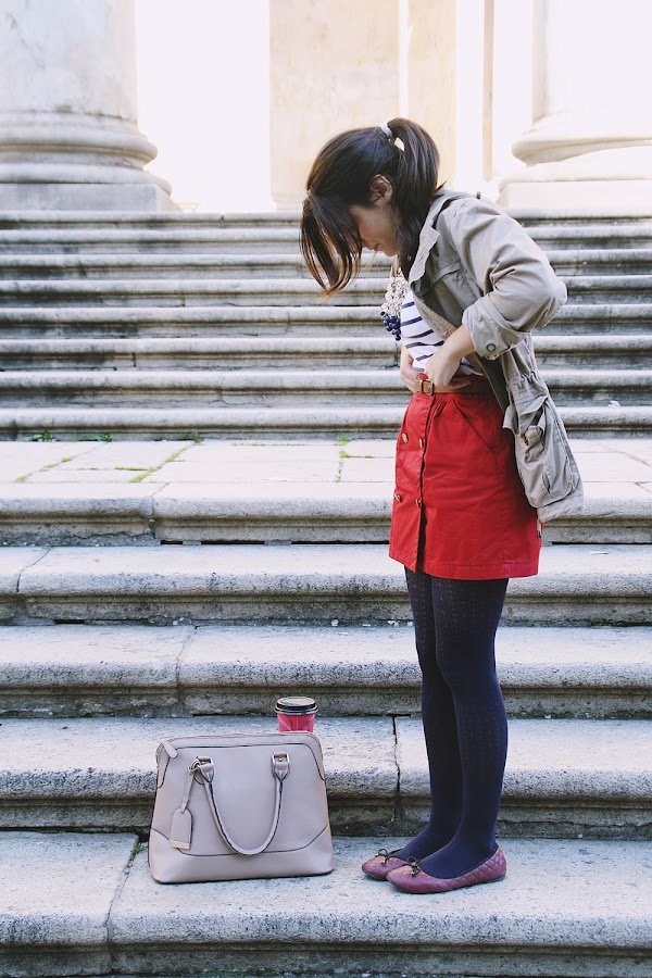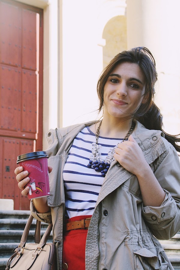 Ese día todavía hacía muy bueno, así que llevé ese "chubasquero" marrón que hace tiempo le robé a mi madre, y debajo llevaba una camiseta a rayas de manga francesa. No se necesitaba más, la verdad. Además, el café me calentaba las manos. Hacía tiempo que quería combinar esa camiseta con la falda de botoncitos, que, por cierto, pensaréis que es actual por toda esta moda de los botoncitos, pero la dura realidad es que es de hace por lo menos tres años, cuando la conseguí por un precio estupendo en las rebajas de Springfield. Yep. Las modas vuelven.