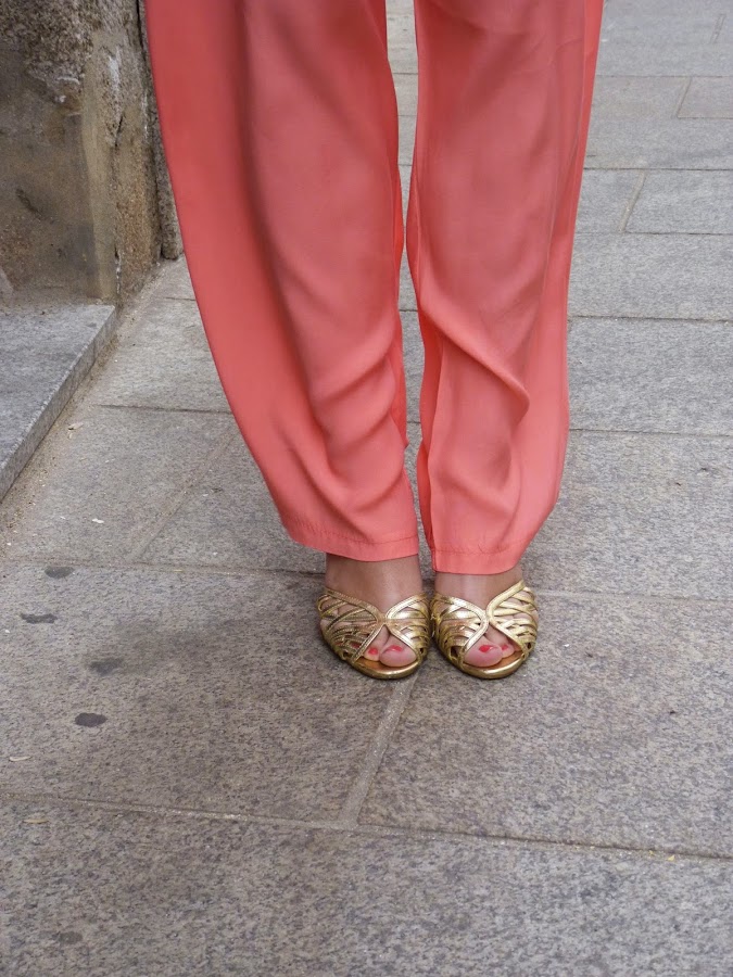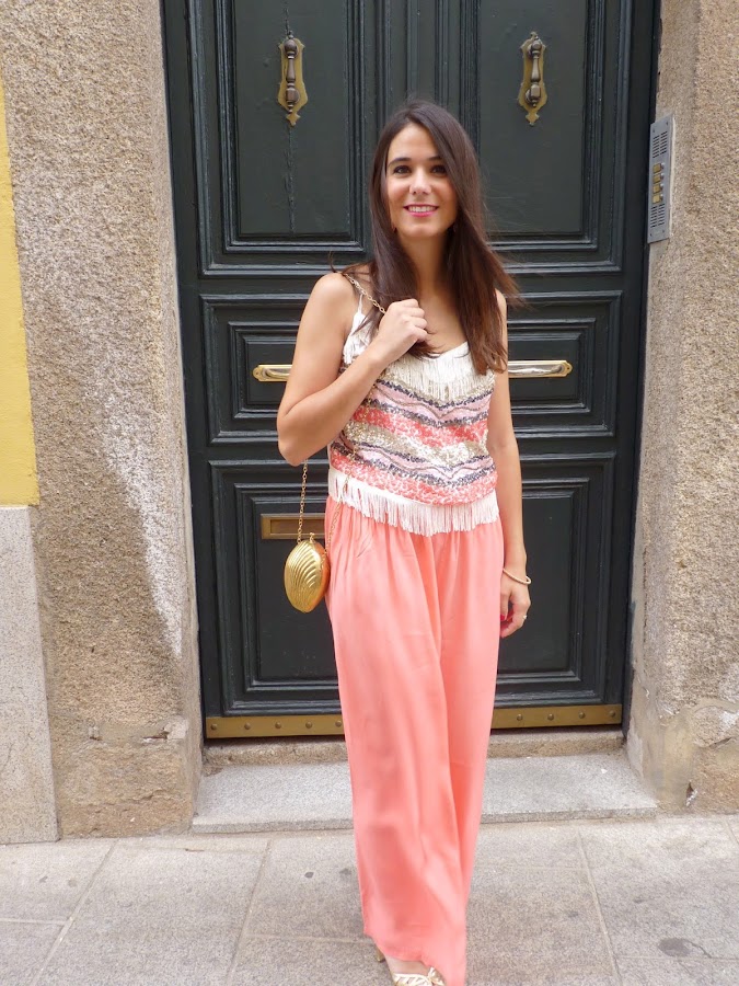 Para mi look elegí estos palazzo rosas de La NUN y un top de pailletes y flecos en los mismo tonos. Para zapatos y bolsos opté por el dorado, con este bolso concha de Compañía Fantástica, unas sandalias vintage que me encantan y mi pulsera de Viceroy de Joyería Loan que ya os enseñé aquí.