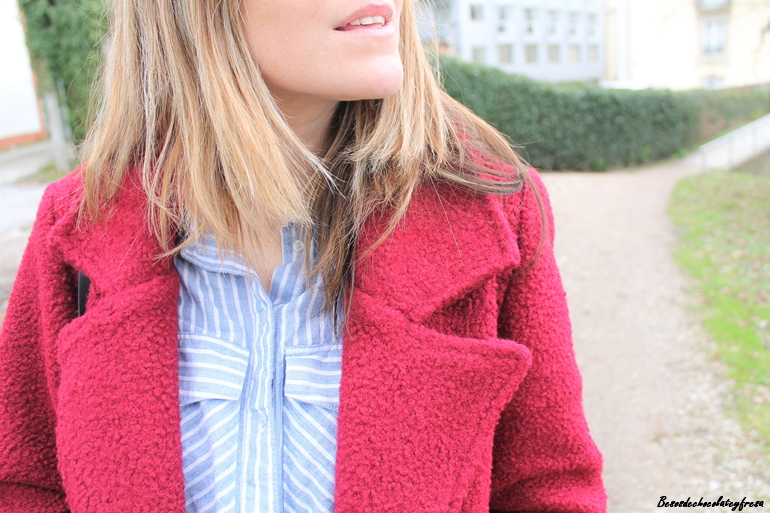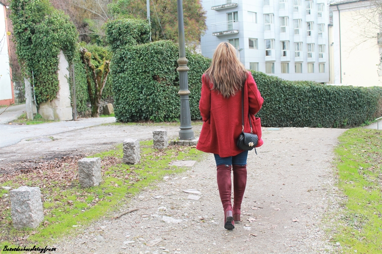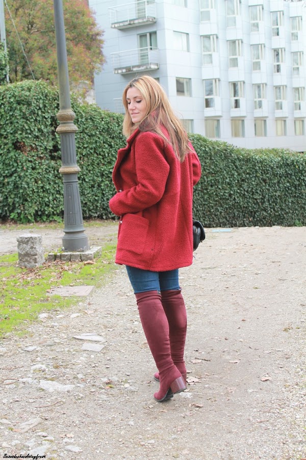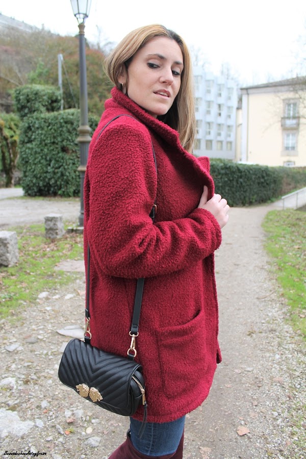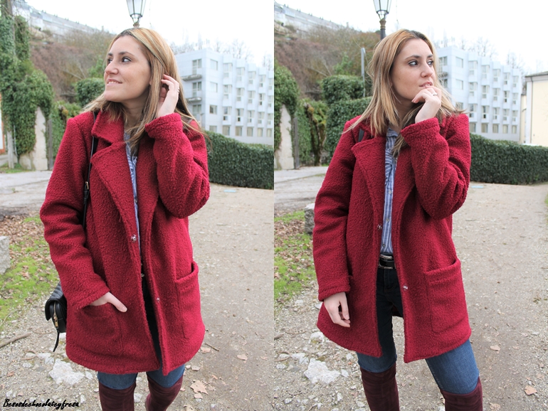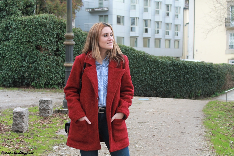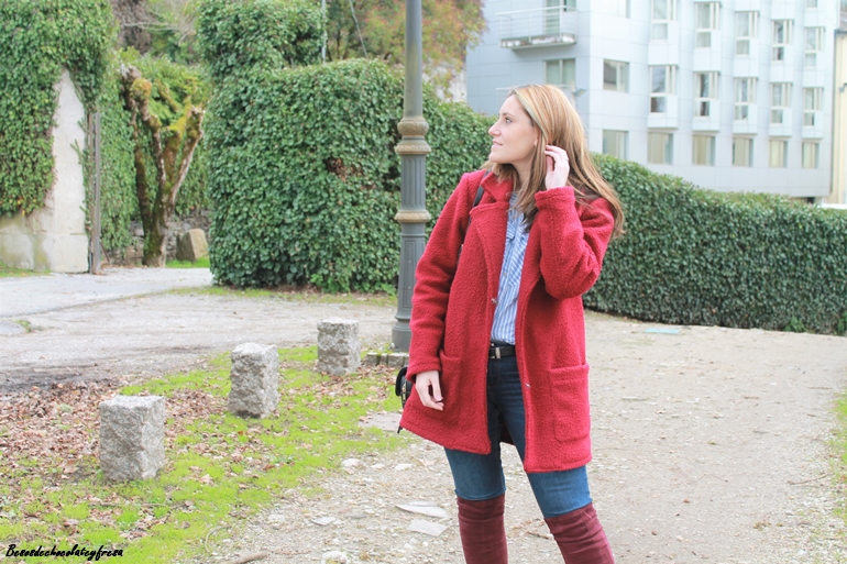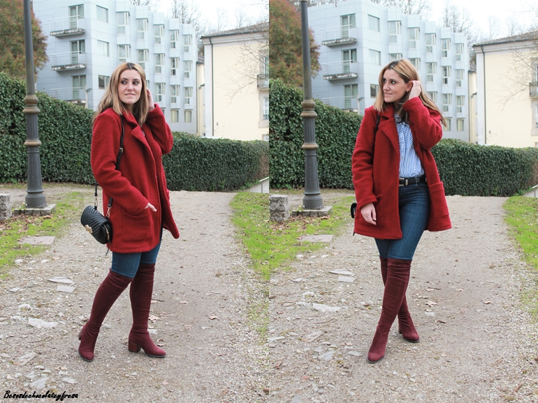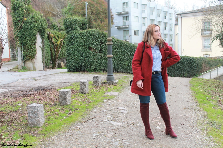 En este caso os vuelto enseñar este abrigo en color burdeos combinado de otra manera (una prenda no se necesita en el armario si no la podemos combinar de 3 maneras diferentes). Aposte por el estampado a rayas y en celeste para hacer e contraste con camisa y jeans oscuros. Botas over the knee en antelina y también borgoña y bolso negro.