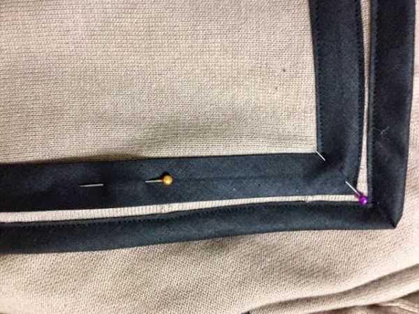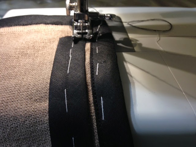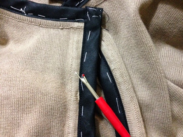 Cortamos los puños y el bajo e hilvanamos la cinta ancha a al biés justo por todo alrededor.