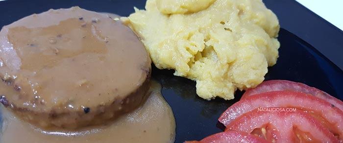 Hamburguesa de soja con puré de patata y calabaza (muy especiada tanto la hamburguesa como el puré, yo estoy acostumbrada a sabores más sencillos)