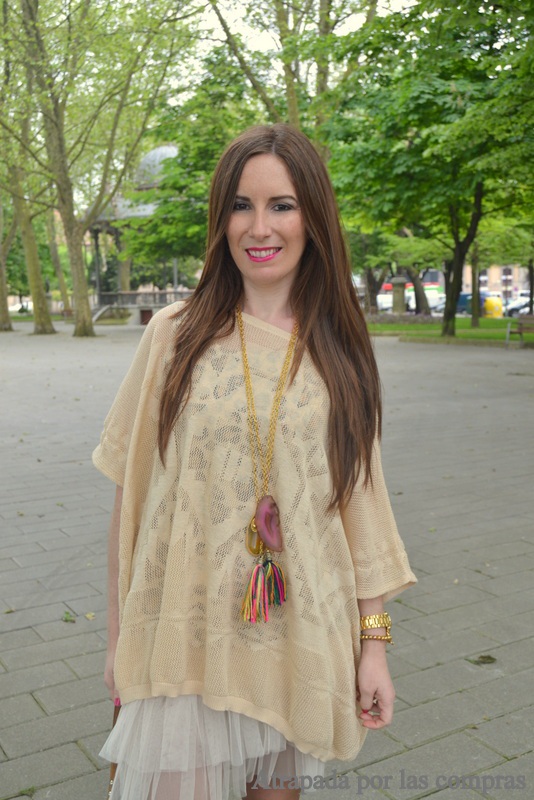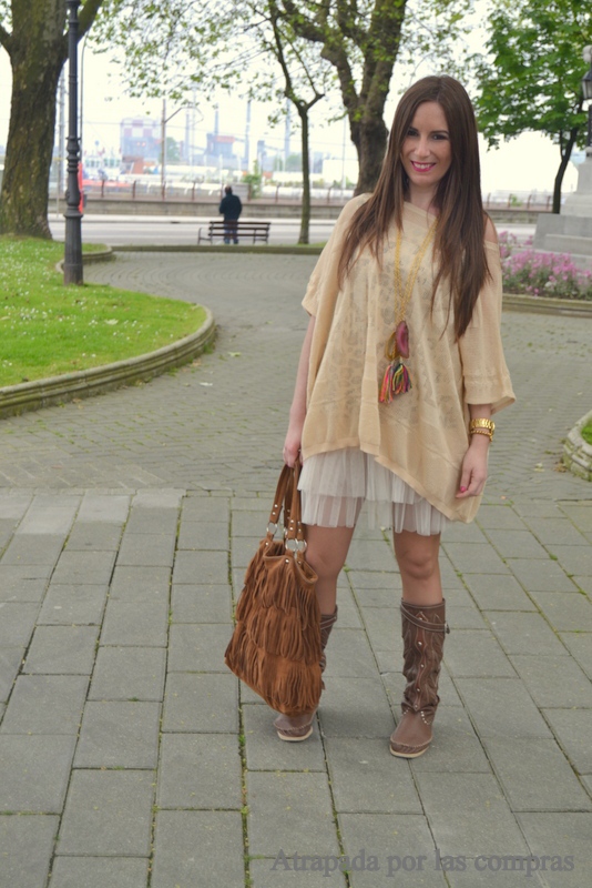 Pues precisamente inspirándome en estos festivales y en los looks que podemos ver en ellos hoy os traigo un look festivalero y muy para el fin de semana, con ese aire de estilo boho que tanto me gusta. Está compuesto por prendas muy cómodas, por un lado un vestido tutú al que se le pueden dar muchas utilidades, de hecho alguna vez me lo habéis visto en looks más de invierno con jerseys y medias y por otro un maxi poncho, este tipo de prendas me parecen una alternativa ideal al cardigan de punto y es muchísimo más estilosa, si os animáis con uno procurar que tenga algo de estampado étnico como éste, son lo más esta temporada. Debajo llevaba una camiseta de estampado animal print que contrastaba con el resto del look y que podéis ver en el enlace que os dejo más abajo. De calzado que mejor que las botas Hector Riccione, ahora que espero que llegue el buen tiempo y deje de llover las comenzaré a poner un poco más a menudo y, como no, mi inseparable bolso de flecos, más de tendencia que nunca esta temporada que tanto se llevan los flecos.