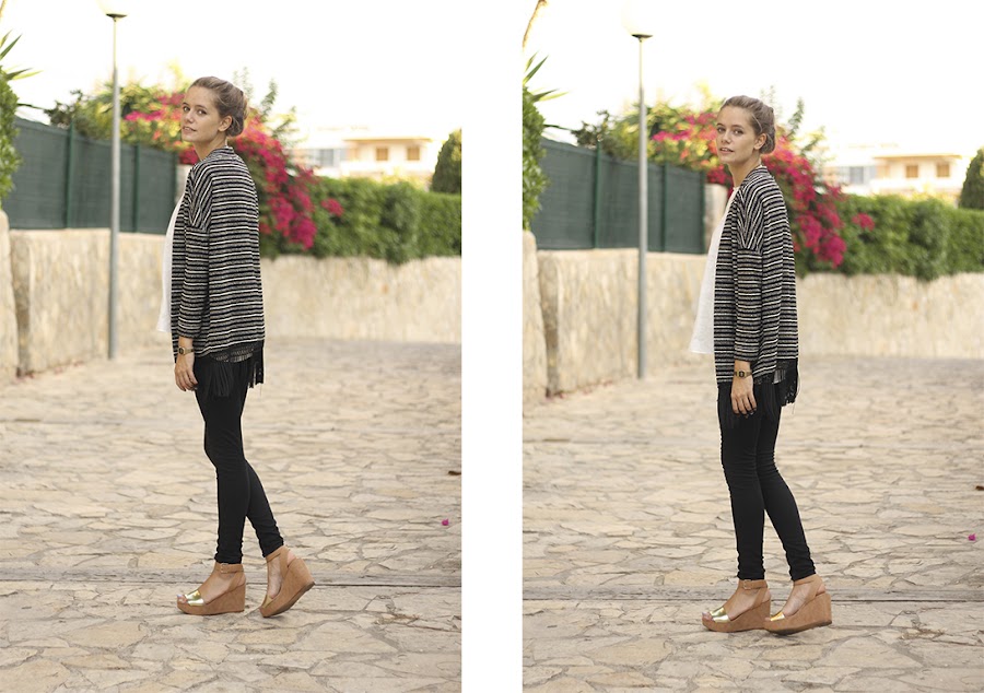 Dejando eso a parte, hoy os propongo un look de entretiempo. Odio cuando ni hace frío para ponerme un chaqueta, ni calor para ir en tirantes... Por eso he optado por un kimono que me lo puedo quitar en cualquier momento. ¡Como siempre yo fan a las combinaciones B&W!