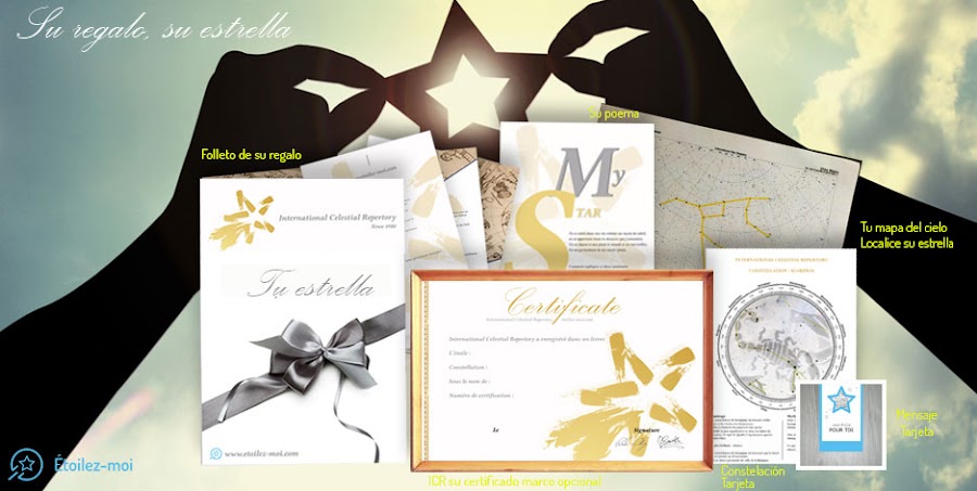 En la web de Etoliez-moi puedes elegir lo que más te guste. Cada estrella bautizada lleva su certificado ICR (International Celestial Repertory), que ubica la estrella en el espacio exterior, y la identifica con su propia tarjeta de identidad, para conocer sus características y encontrarla en el cielo.