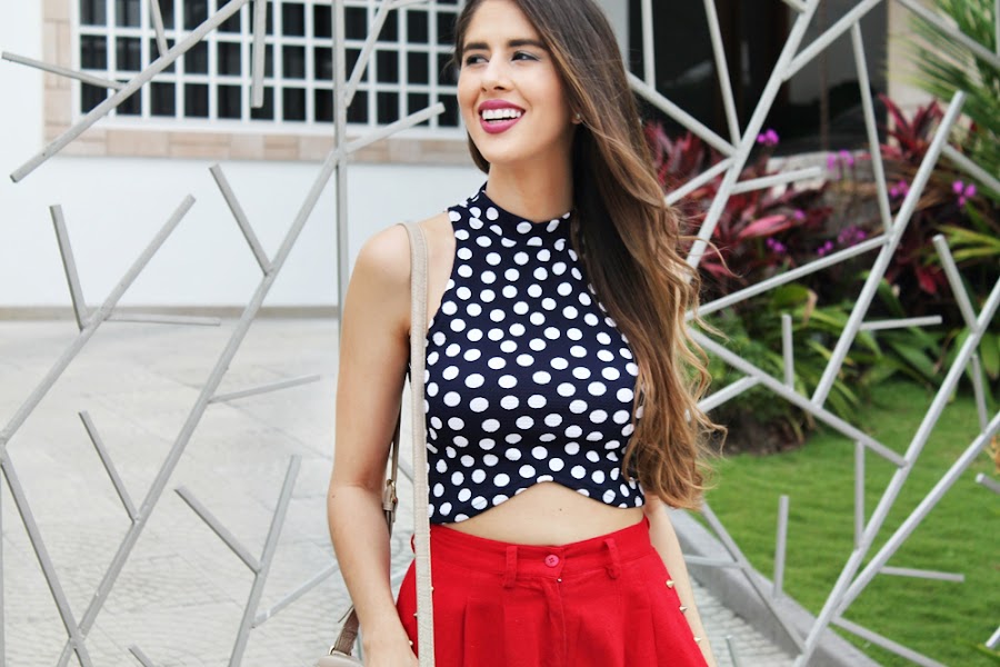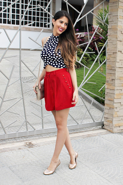 El look que les muestro el día de hoy me transporta a otra época. Y eso justamente me encanta de la moda, poder jugar con prendas y teletransportarnos. Decidí usar este crop top azul de lunares con el short rojo con tachuelas para darle un aire más "navy" por sus colores, ambos de diseño nacional (y mejor aún de mi ciudad) puedes encontrarlos AQUÍ EN INSTAGRAM.