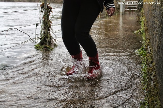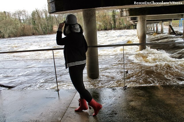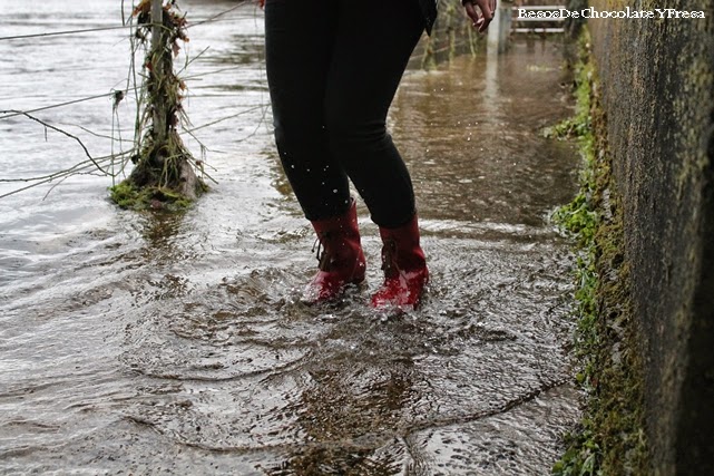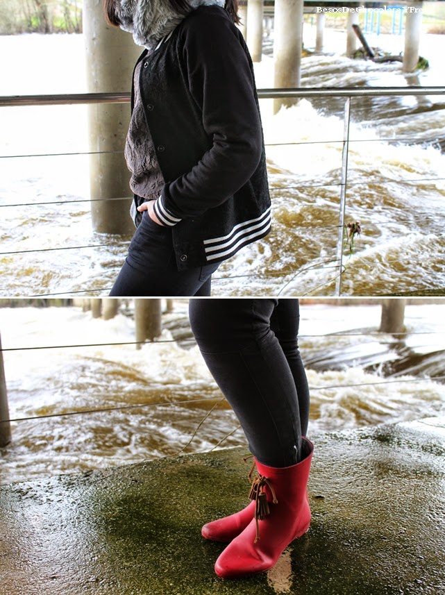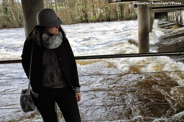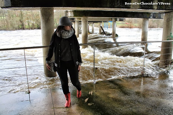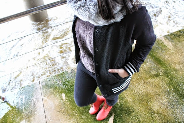 Llevo jeans negros con sweater de peluche y beisbolera, botas de agua en rojo para darle algo de color al look, bolso y gorro en gris y mi super cuello, mi aliado de este invierno.