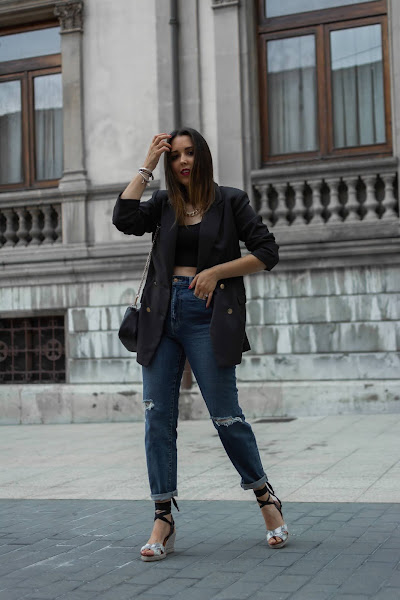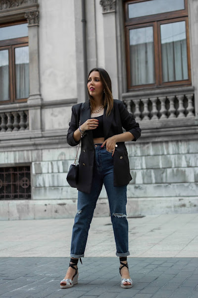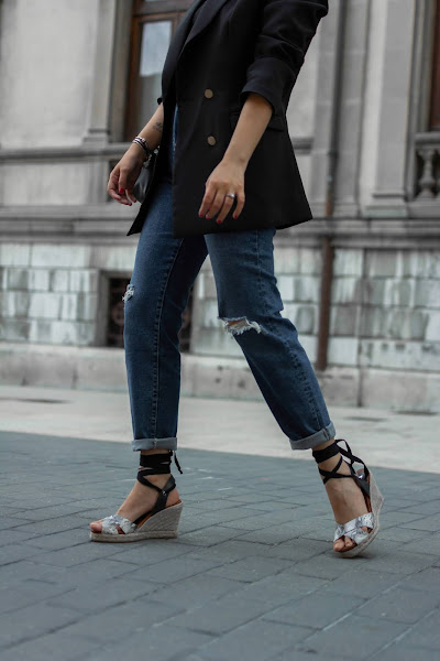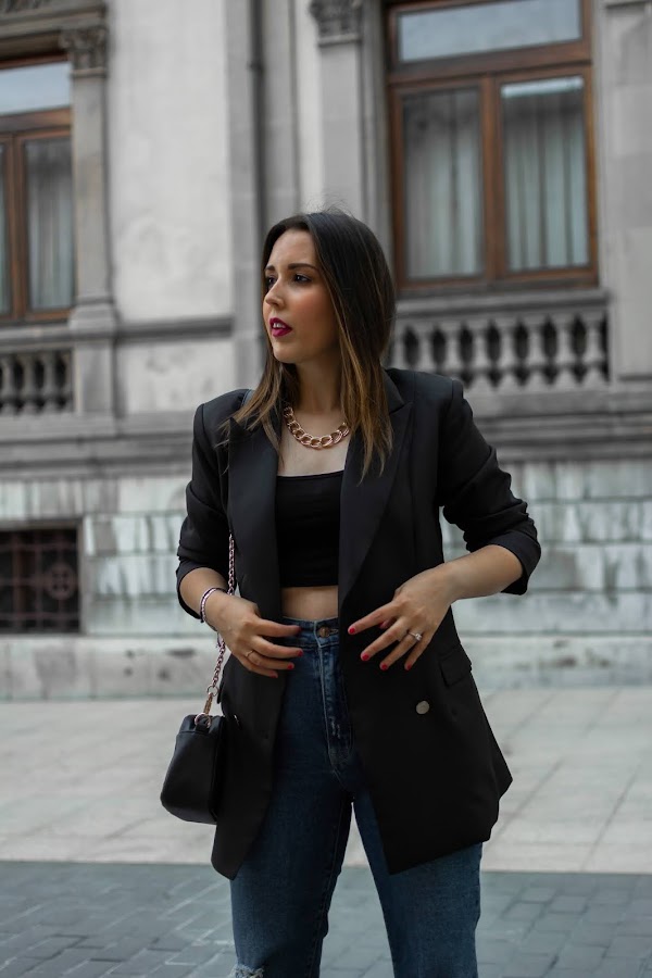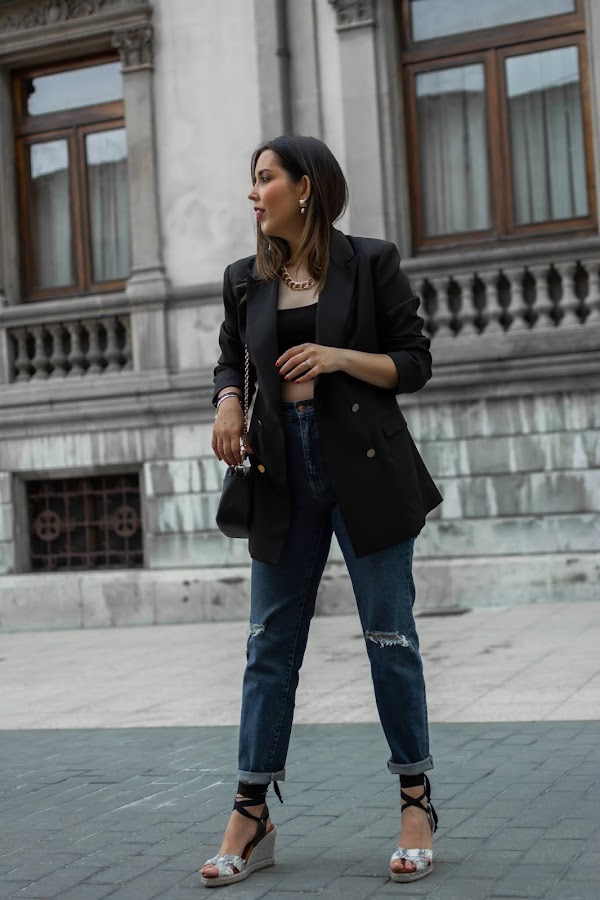 Y sinceramente, después de un finde algo más animada, me he decidido a salir aunque fuesen 5 minutos a sacarme unas fotos y hacer una mezcla entre verano y otoño en este look. Es complicado crear oufits en este tiempo y más en Asturias, con todo esto, tengo mucha ropa acumulada que me habían enviado para enseñaros durante el verano y estoy un poco confusa en como crear looks con ella en este tiempo. ¿Lo conseguiré? Es todo un reto. Mientras tanto, hoy os traigo este básico, de esos que tanto me gustan. Una blazer preciosa de Lookbook Store, en color negro y con botones dorados. En realidad, se puede cruzar, pero yo he decidido llevarla abierta para combinarla con un pequeño top negro y darle ese toque más veraniego. Unos mom jeans de temporada que me compré hace unos días en Stradivarius y lo mejor de todo, darle una segunda vida a las sandalias más allá del verano. Son unas alpargatas de cuña de esparto e interior en piel y la verdad es que no os podéis imaginar lo cómodas que son. Están realizadas en España y podéis encontrarlas en Ercilla Calzados, además de que como final de temporada, están súper bien de precio y aún podéis utilizarlas con looks como el que hoy llevo.