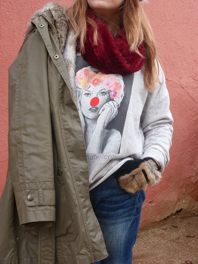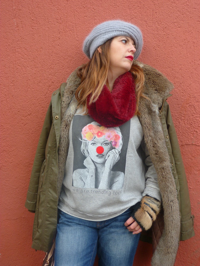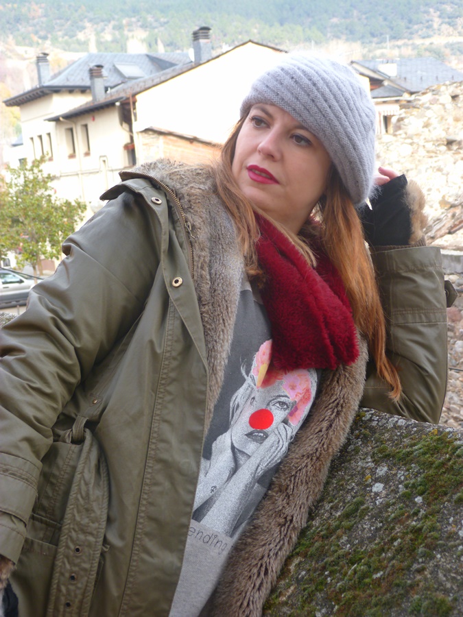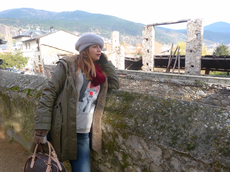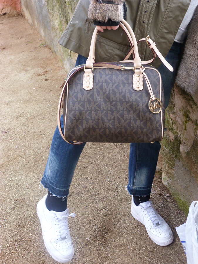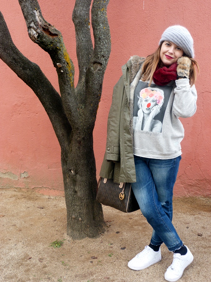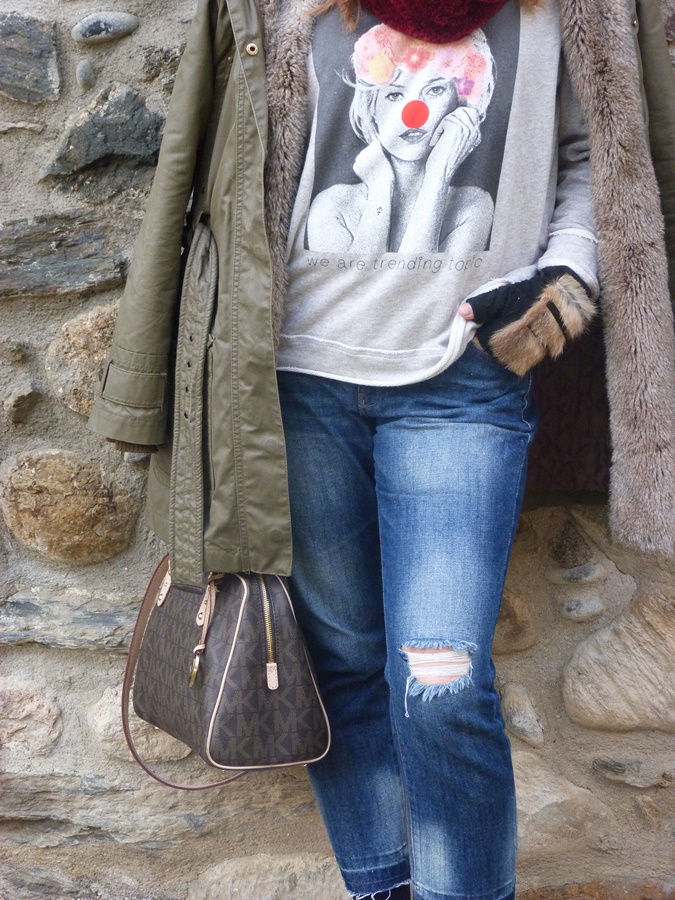 Para éste look y pensando en el fresquito que podía hacer por allí la combiné con pantalón tejano ripped, Nike Air y parka verde con capucha y pelo y como complementos boina de lana, cuello peludo y mi adorado bolso Michael Kors, espero que os guste ;)