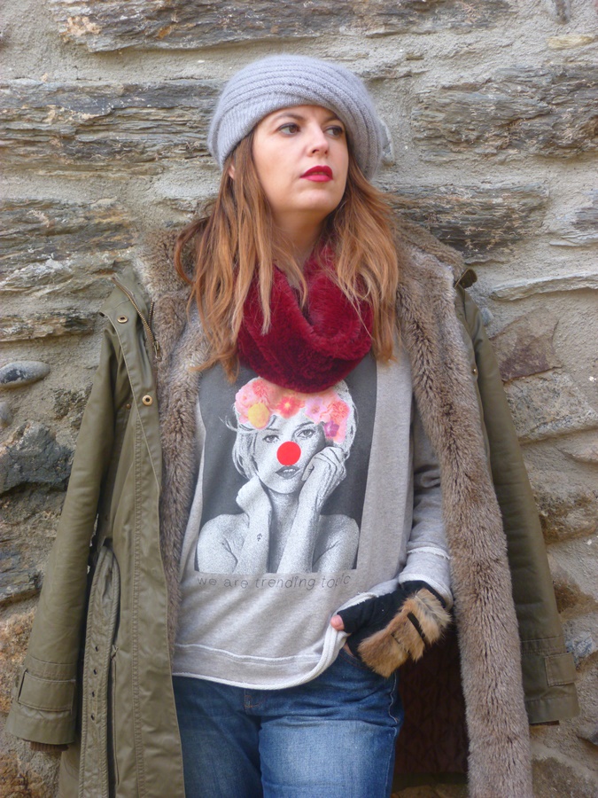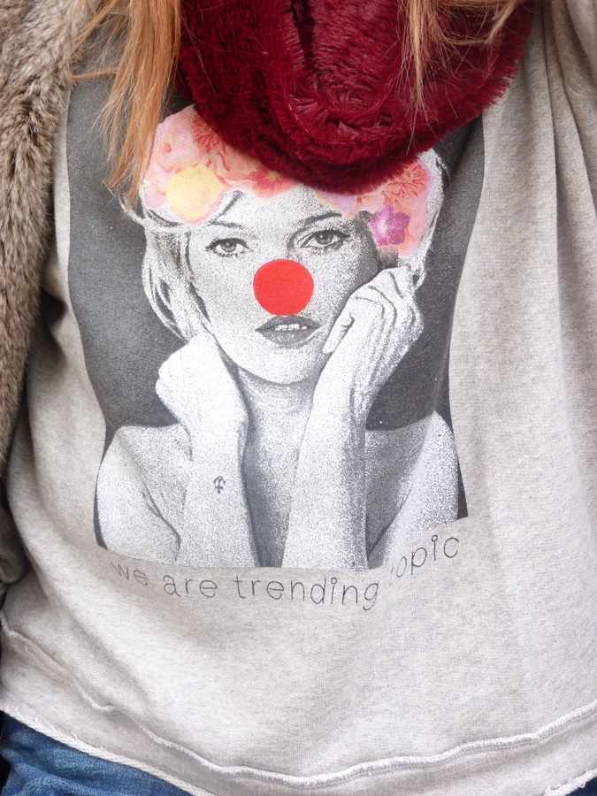 No os podéis imaginar lo cómoda y cálida que es la sudadera, me ha encantado el tejido tan suave que tiene, el corte oversize y la ilustración tan divertida de Kate Moss con nariz de payaso y diadema de flores, ¿no os parece adorable? pues en la web tenéis muchos modelos más a elegir y cada cúal más bonito ;)