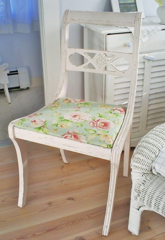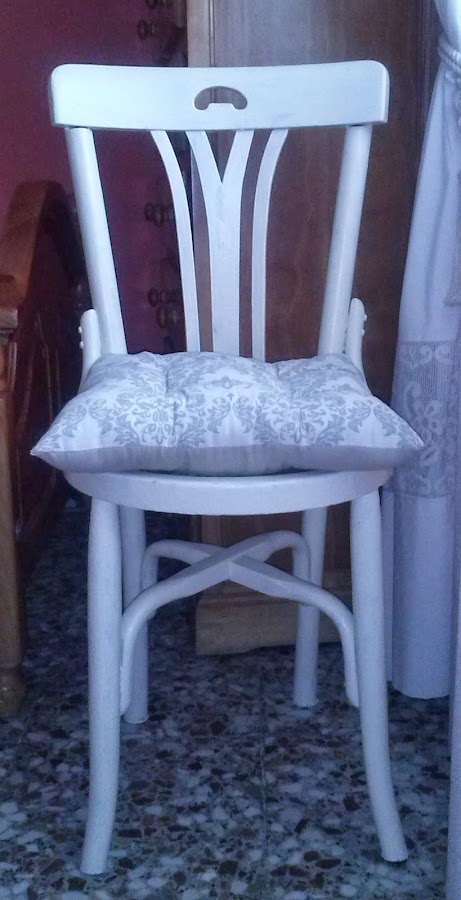 Pues bien, hace unos meses encontré en el trastero una silla, de casa de mis abuelos, que no pude dejarla allí pues enseguida se me ocurrió cambiarle el color y colocarle algún cojín mono para tenerla en mi habitación. Y aquí tenéis el resultado: