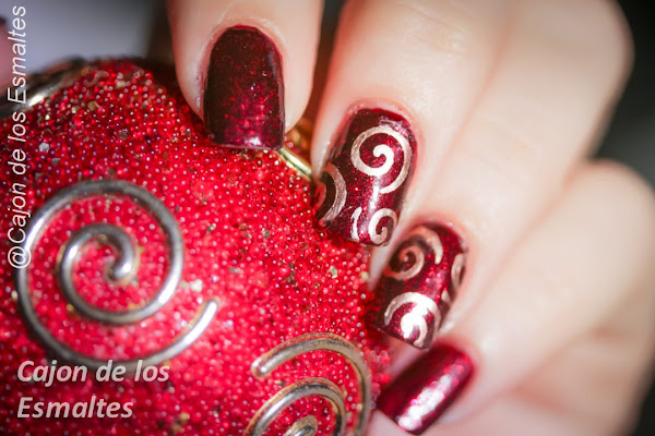 A priori no me imaginaba un diseño navideño con el espiral hasta que armando el arbolito reparo en estos adornos justo con el mismo dibujo. Fue agregar rojo y dorado también a las uñas y ¡listo!, decoración navideña instantánea. Antes que me olvide y me pregunten en los comentarios el esmalte rojo de base es Leading Lady de Essie y el cobre Penny Talk también de la misma marca.