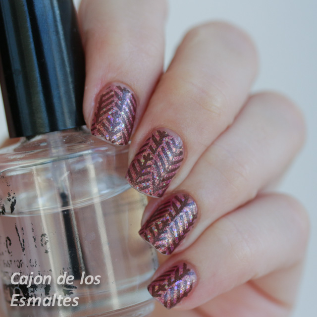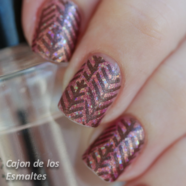 Estamos ya al borde de guardar los neones y arrancar con los tonos de otoño así que en lugar de usar un verde para estampar este diseño de hojas fue por el marrón. La base es el glorioso Zoya - Binx que les mostré antes. Ah y todo el conjunto está matificado.