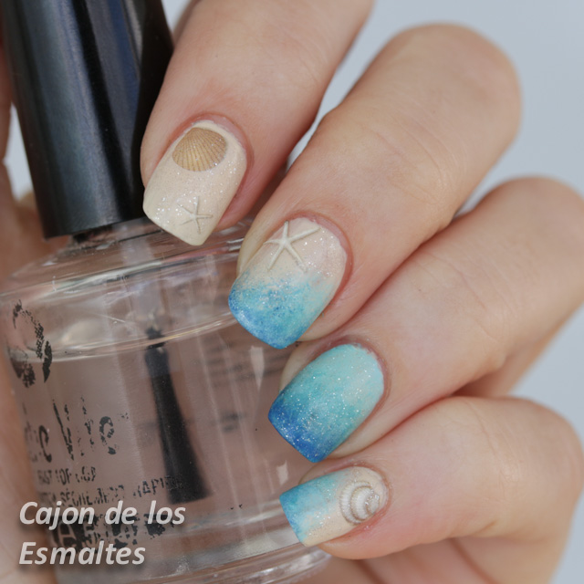 Estos últimos días la inspiración me estaba resultando esquiva así que la invitación de Nail Polish Canada para unirme al "Summer nail art Challenge" me vino como anillo al dedo. Sin duda la playa y el mar son mi parte favorita del verano así que me puse a buscar entre los decals y placas de estampar hasta que una hoja de water decals de BornPretty Store me hizo parar. Enseguida ya tenía elegido el color para la arena (Zoya Jacqueline), tres colores para el mar (Avon Colortrend Azul Perfecto, Jade Alga Marinha y Etude House CGR 705) y el Top Sahara de Dance Legend. Veinte minutos más tarde estaba todo listo!
