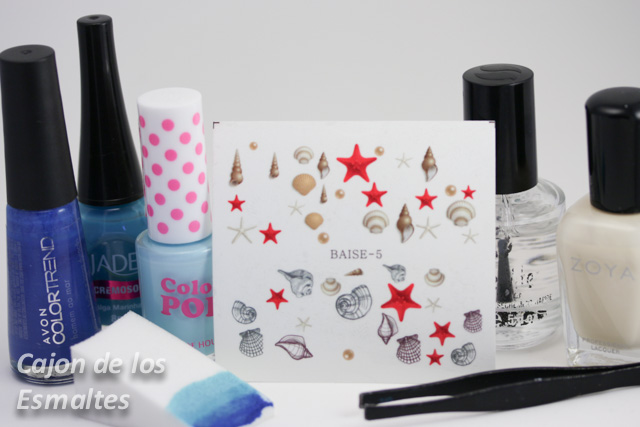 This past few days I"ve been in a creative dry spell regarding nail art and blogging so receiving an invitation from Nail Plish Canada to join their "Summer nail art Challenge" was a godsend. Sea and beaches are my favorite part of summer so with that idea on my mind I went through my plate and decal collections until I found this one from Born Pretty Store. A few minutes later I had picked the perfect color for the sand (Zoya"s Jacqueline), three blues for the sea (Avon Colortrend Azul Perfecto, Jade Alga Marinha y Etude House CGR 705) and the final touch by Top Sahara from Dance Legend.