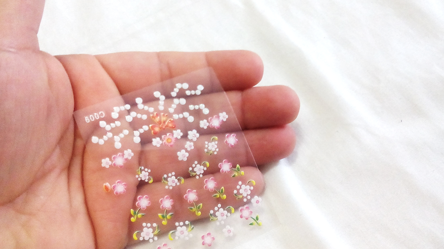Una vez seco, apliqué a un lado de la uña del dedo grande, un sticker de flores que tiene una ligera curvatura
