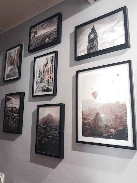 Los pósters elegidos fueron: Pájaros (40x50), Mountain Mist (30x40), Capadocia Globos de Aire (30x40), Bear (30x40), Morning Sun (30x40), Venecia (21x30), Ampersand & Marble (21x30), Calle Rosa (21x30), Bosque Soleado (21x30) y Sobre las Nubes (13x18). También cogí unos marcos para ponerlos. Seis negros de madera, tres de ellos de 31x30, uno de 13x18, uno de 30x40 y uno de 40x50. Y cuatro dorados de metal, uno de 21x30 y tres de 30x40.
