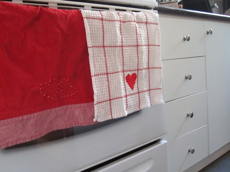 Unos simples paños de cocina le darán el toque de color y romanticismo a tu cocina, también puedes colgar guantes para el horno o si tienes utensilios o electrodomésticos rojos es el momento de sacarlos y jugar con la decoración.