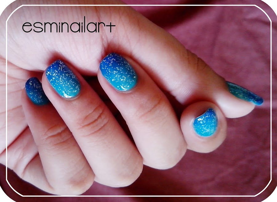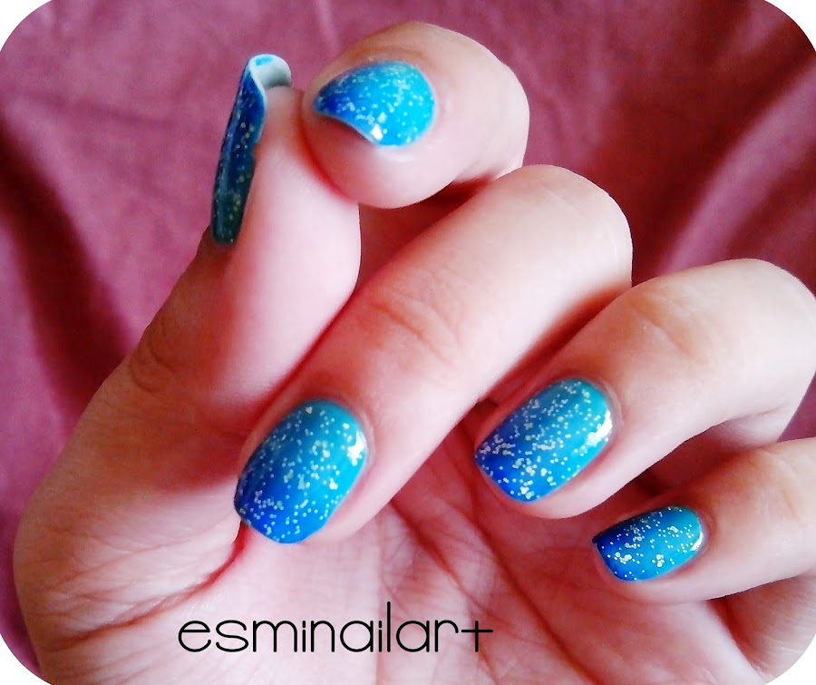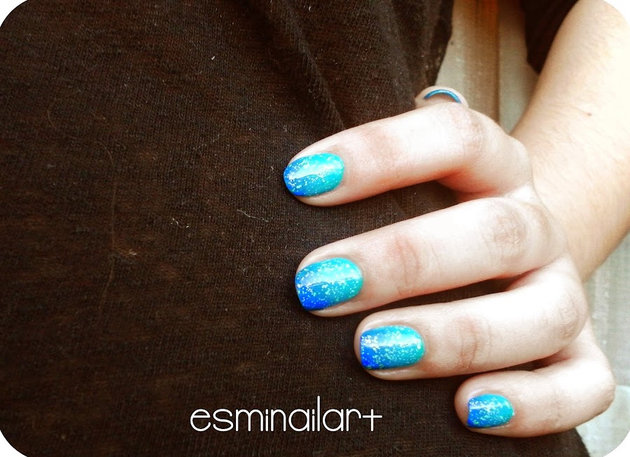 Para este degradado utilicé los tonos 02, 03 y 04 de esta colección, un verde mar, un azul claro y un azul klein eléctrico (que podéis ver aquí). No estaba muy segura que el paso entre verde y azul fuera a quedar muy bien, pero la verdad es que quedé muy contenta con el resultado. Por encima utilicé el esmalte G2-4 de la colección Glow in the dark with coke de Yes Love.